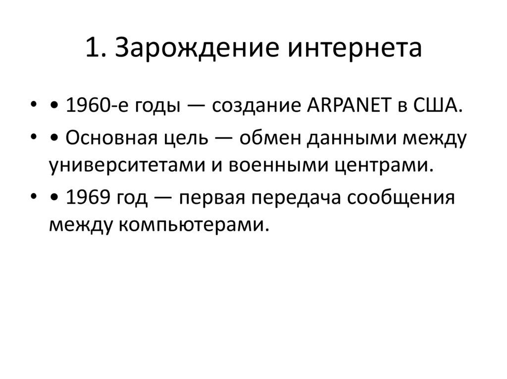 1. Зарождение интернета• • 1960-е годы — создание ARPANET в США.