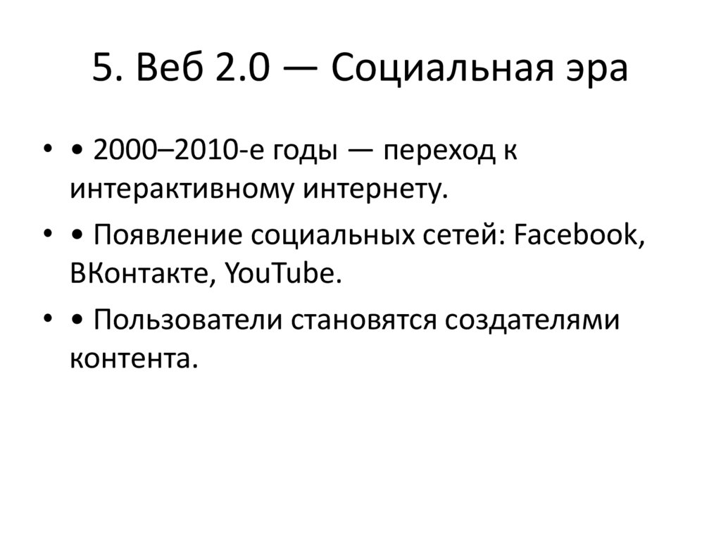 5. Веб 2.0 — Социальная эра• • 2000–2010-е годы — переход к