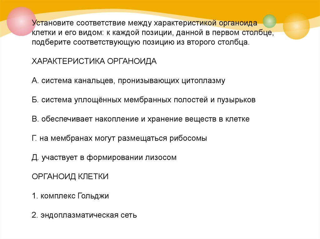 Установите соответствие между характеристикой органоидаклетки и его видом: к каждой позиции, данной в первом столбце,