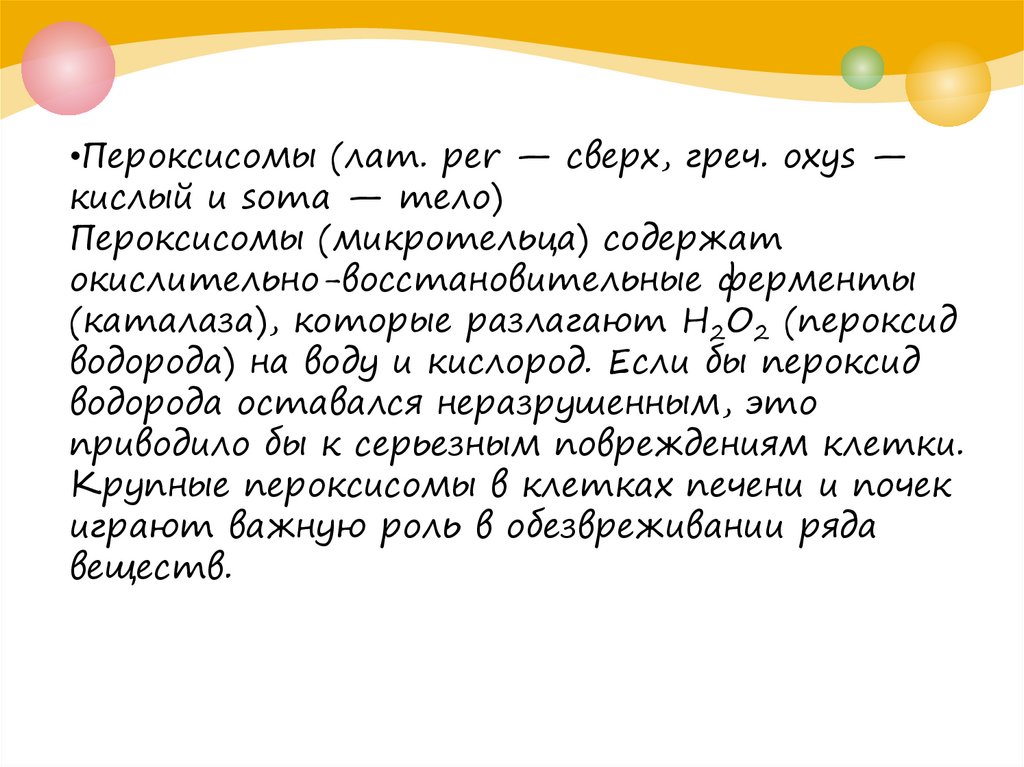•Пероксисомы (лат. per — сверх, греч. oxys —кислый и soma — тело)