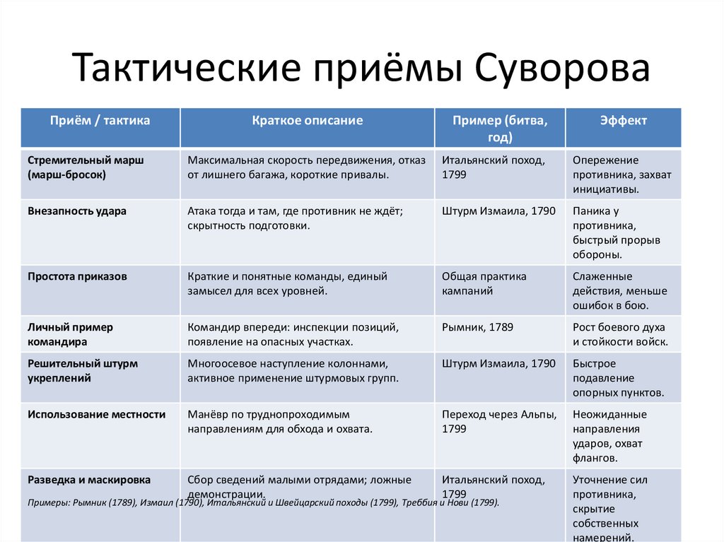 Примеры: Рымник (1789), Измаил (1790), Итальянский и Швейцарский походы (1799), Треббия и Нови (1799).