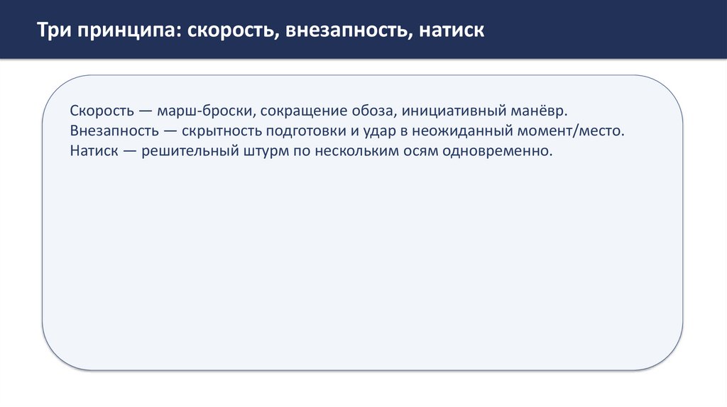 Три принципа: скорость, внезапность, натискСкорость — марш-броски, сокращение обоза, инициативный манёвр.