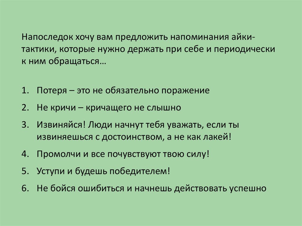 Напоследок хочу вам предложить напоминания айкитактики, которые нужно держать при себе и периодическик ним обращаться…