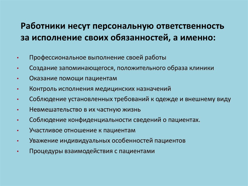 Работники несут персональную ответственностьза исполнение своих обязанностей, а именно: