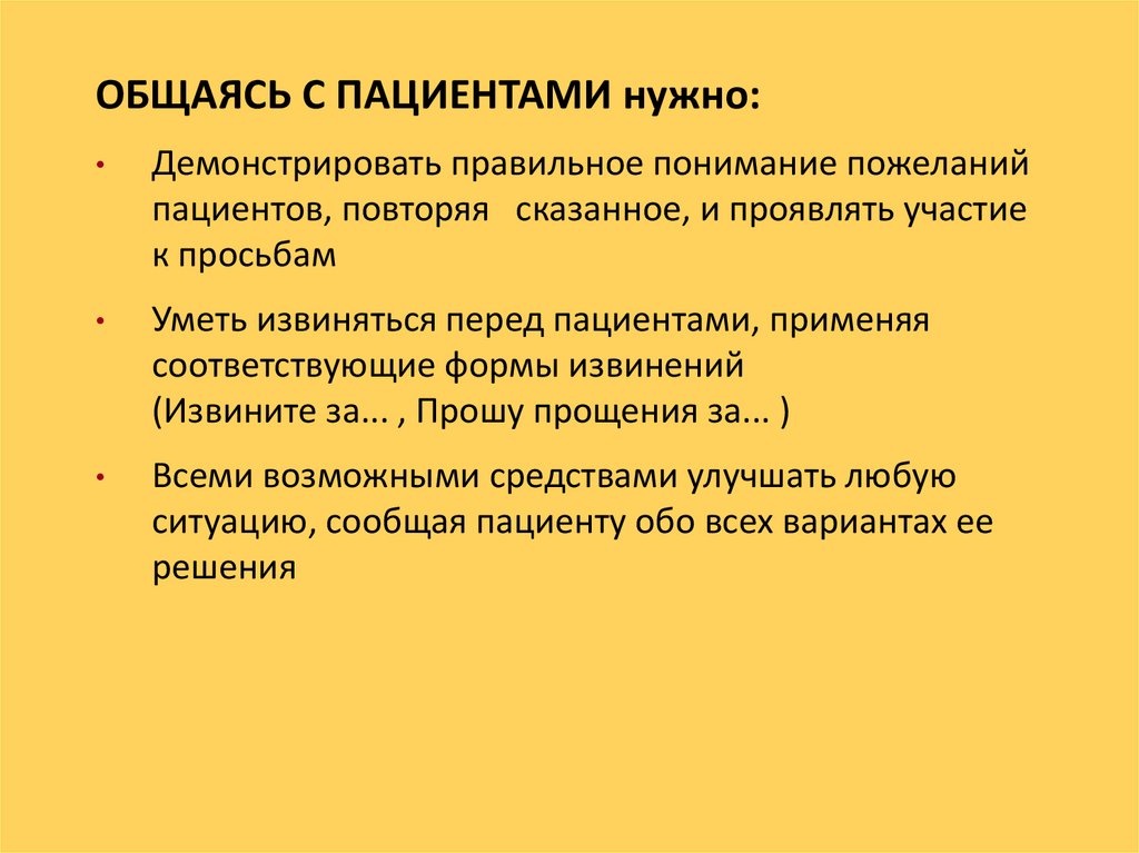 ОБЩАЯСЬ С ПАЦИЕНТАМИ нужно:Демонстрировать правильное понимание пожеланий