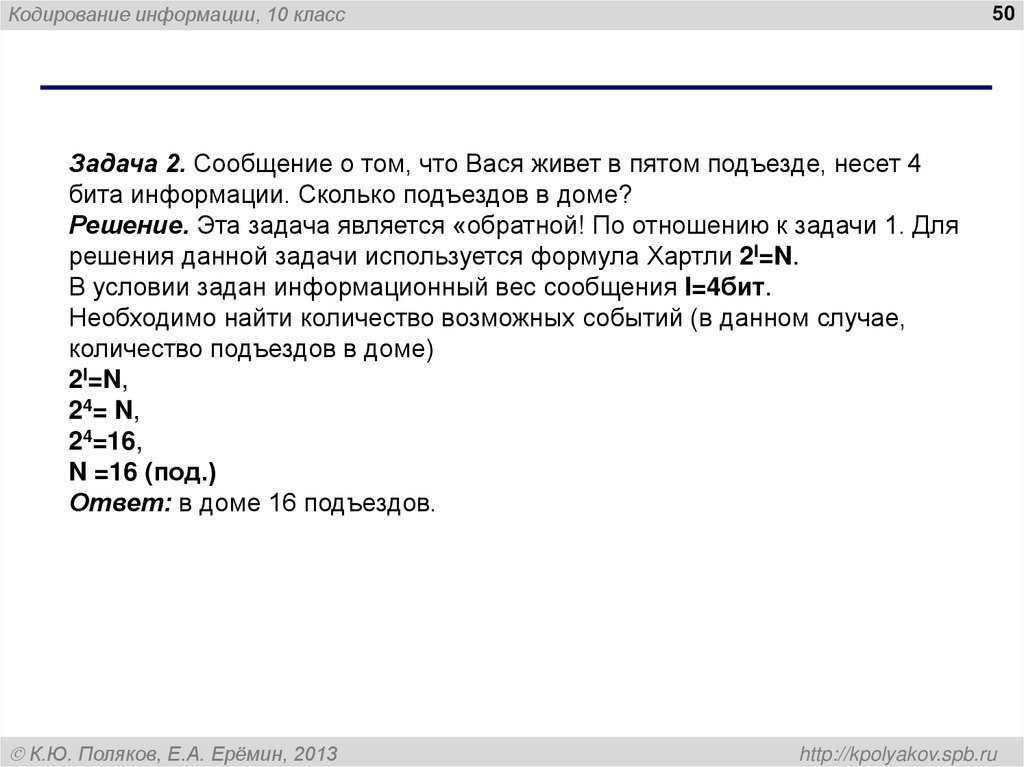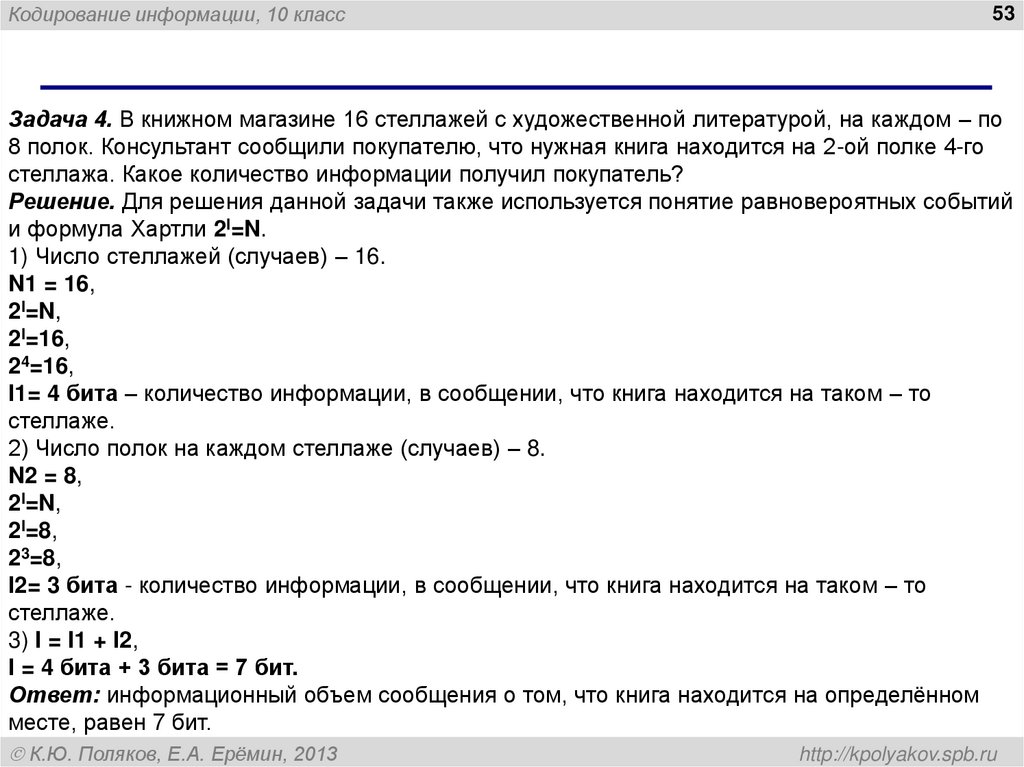 I1= 4 бита – количество информации, в сообщении, что книга находится на таком – то