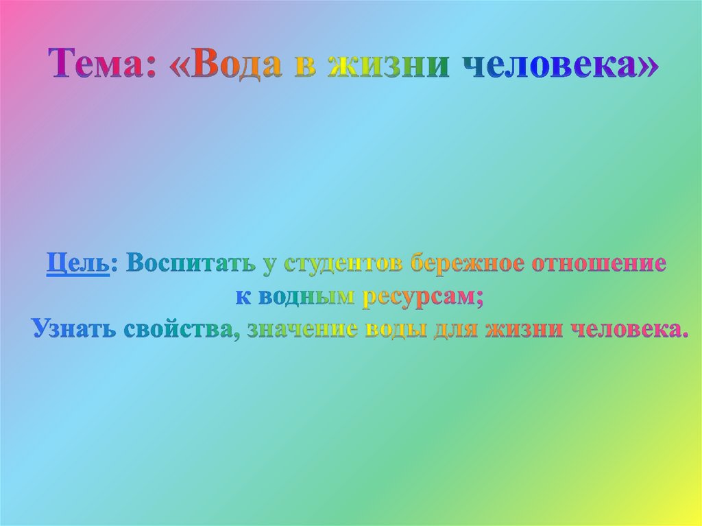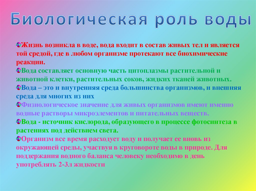 Жизнь возникла в воде, вода входит в состав живых тел и являетсятой средой, где в любом организме протекают все биохимические