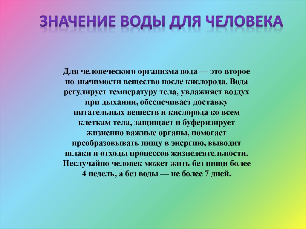 Для человеческого организма вода — это второепо значимости вещество после кислорода. Вода