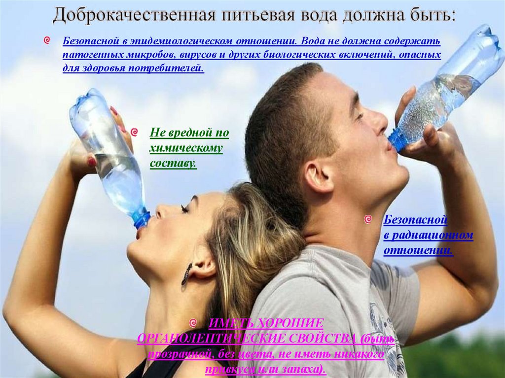 Безопасной в эпидемиологическом отношении. Вода не должна содержатьпатогенных микробов, вирусов и других биологических включений, опасных