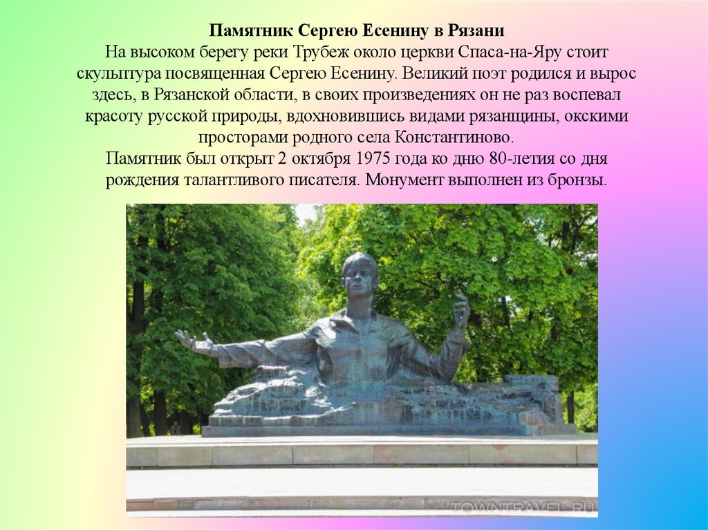 Памятник Сергею Есенину в РязаниНа высоком берегу реки Трубеж около церкви Спаса-на-Яру стоит