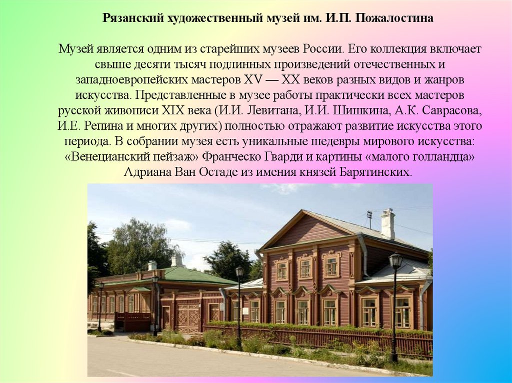 Рязанский художественный музей им. И.П. ПожалостинаМузей является одним из старейших музеев России. Его коллекция включает