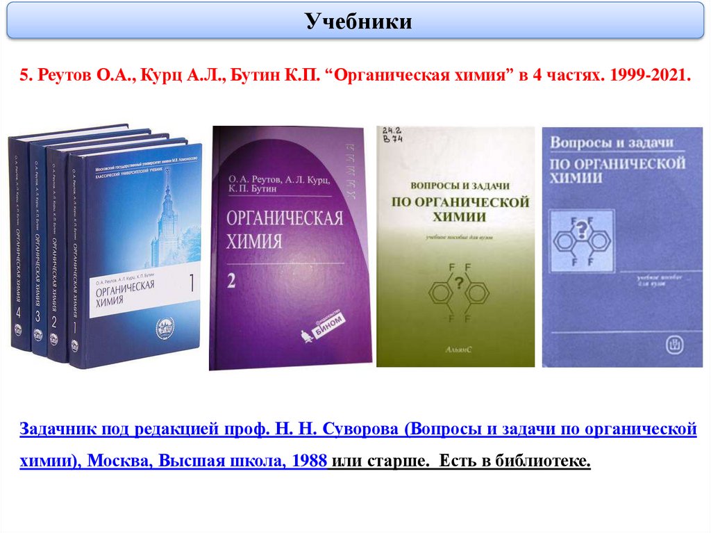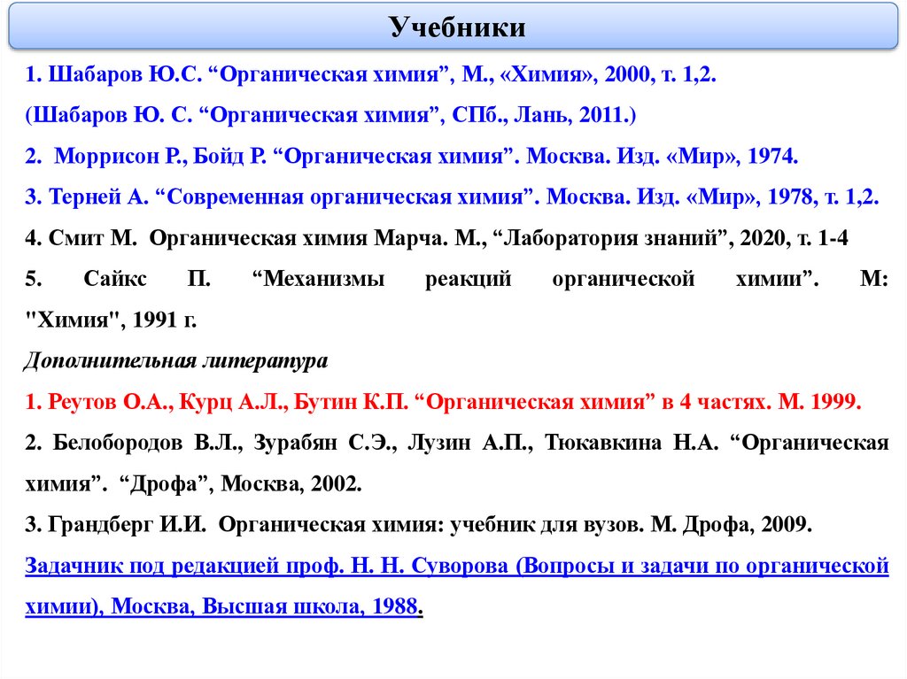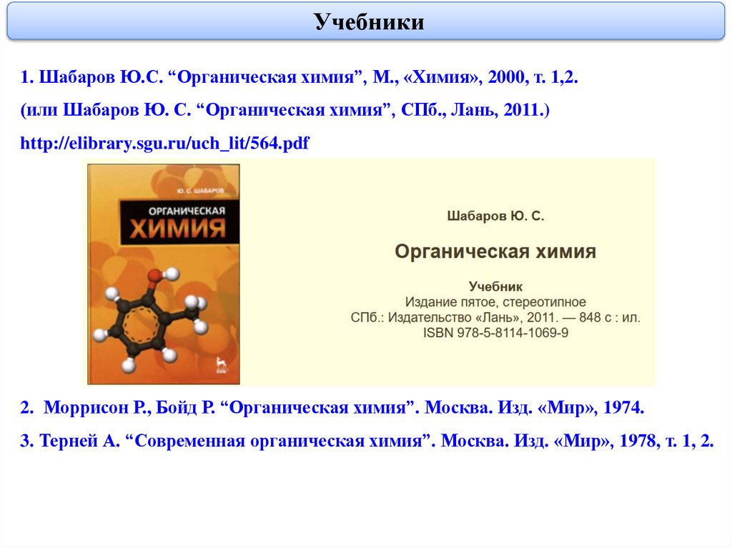 Учебники1. Шабаров Ю.С. “Органическая химия”, М., «Химия», 2000, т. 1,2.