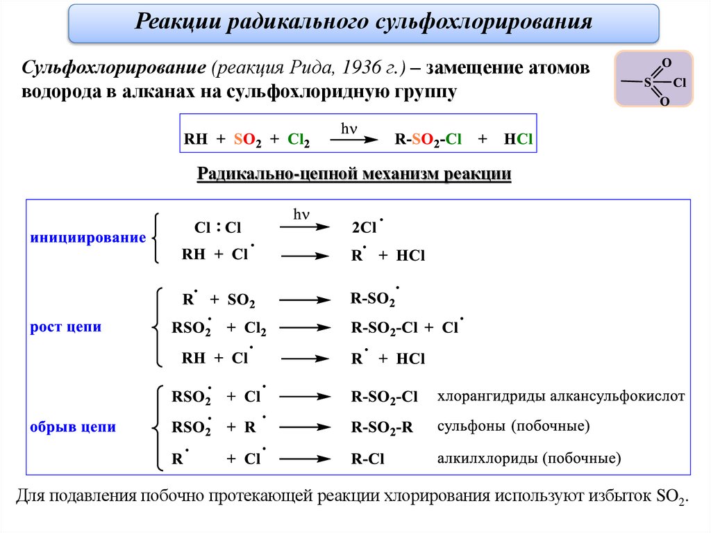 Реакции радикального сульфохлорированияСульфохлорирование (реакция Рида, 1936 г.) – замещение атомов