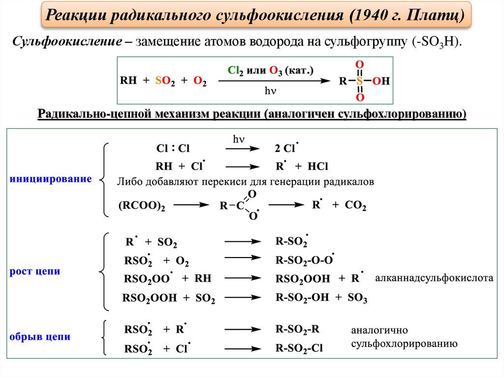 Реакции радикального сульфоокисления (1940 г. Платц)Сульфоокисление – замещение атомов водорода на сульфогруппу (-SO3H).