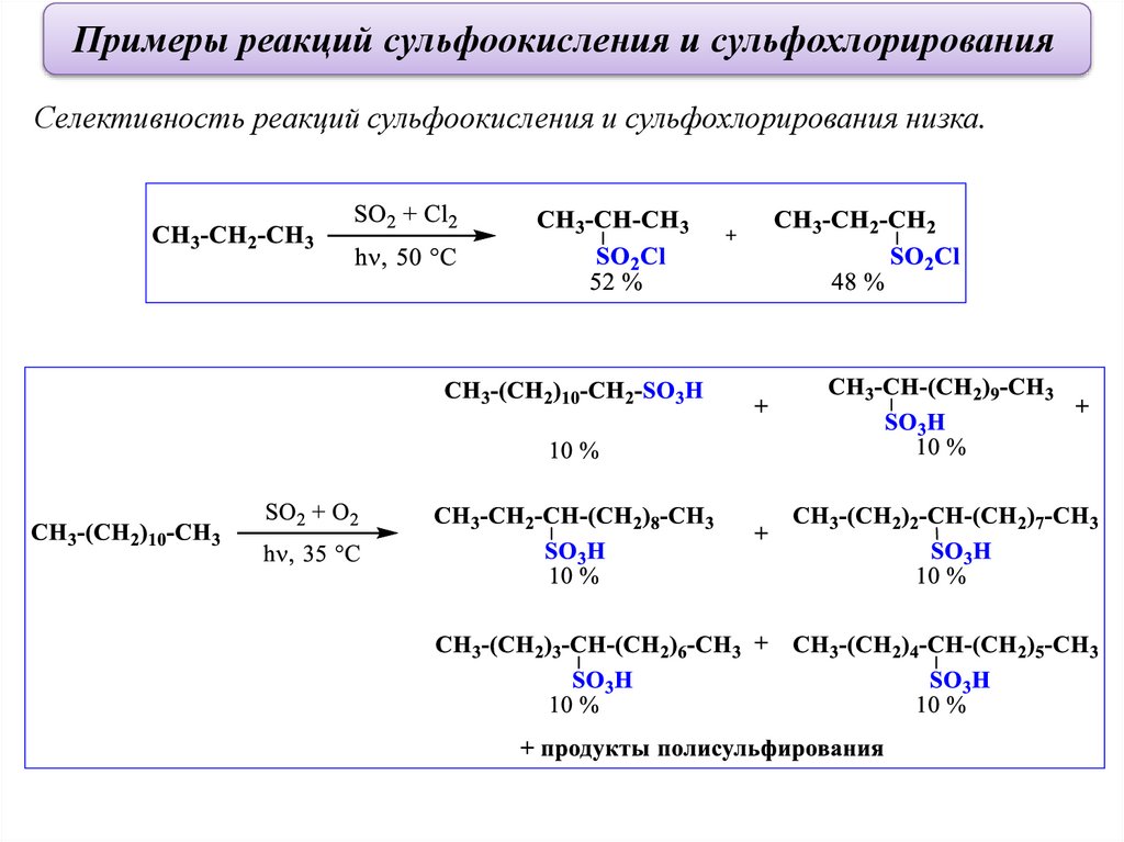 Примеры реакций сульфоокисления и сульфохлорированияСелективность реакций сульфоокисления и сульфохлорирования низка.