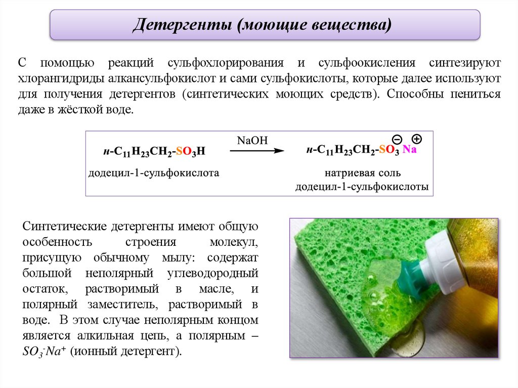 Детергенты (моющие вещества)С помощью реакций сульфохлорирования и сульфоокисления синтезируют