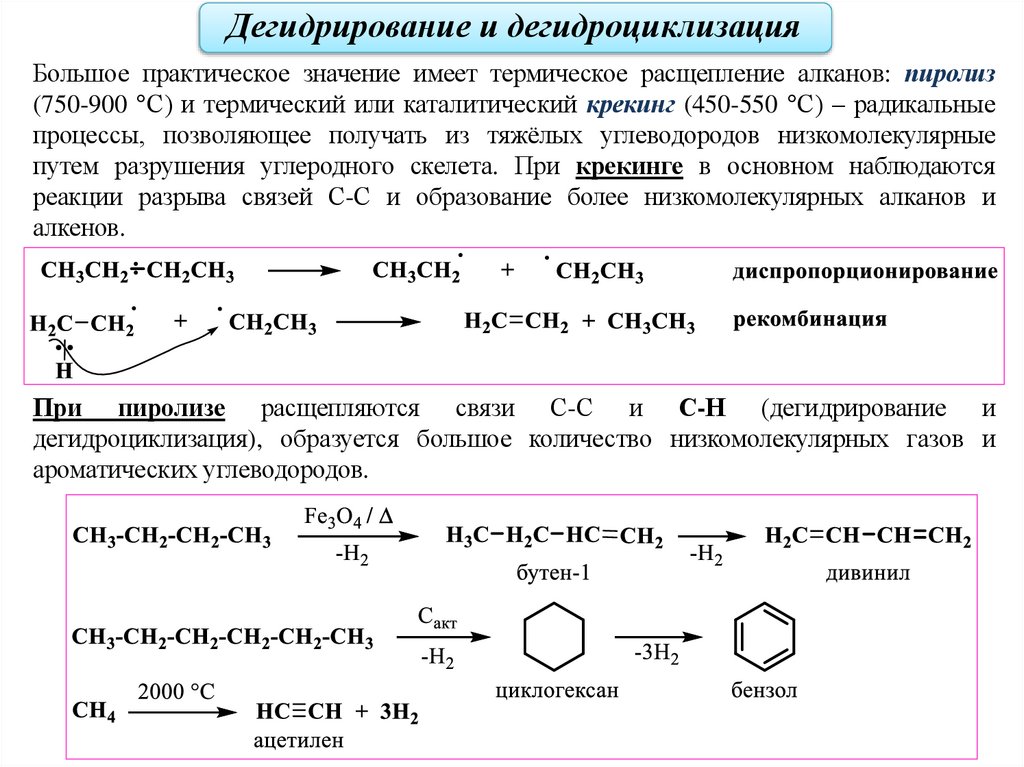 Дегидрирование и дегидроциклизацияБольшое практическое значение имеет термическое расщепление алканов: пиролиз