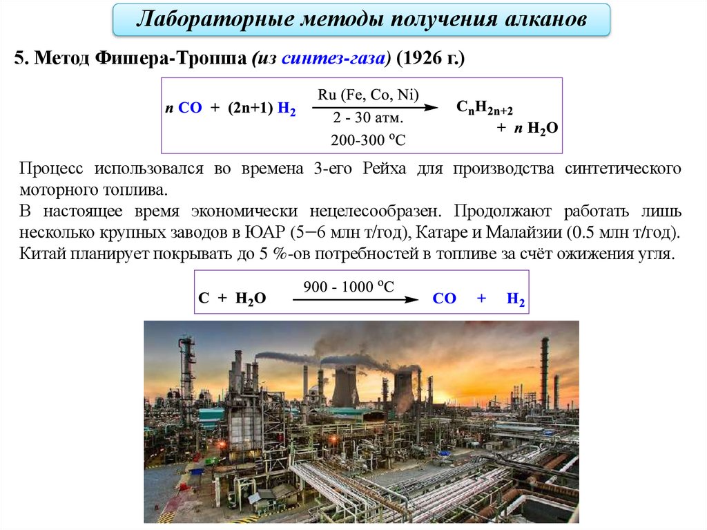 Лабораторные методы получения алканов5. Метод Фишера-Тропша (из синтез-газа) (1926 г.)