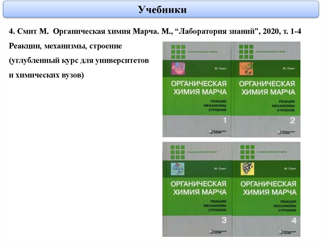 4. Смит М. Органическая химия Марча. М., “Лаборатория знаний”, 2020, т. 1-4