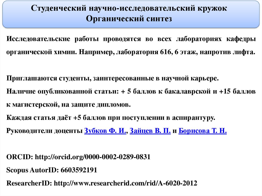 Руководители доценты Зубков Ф. И., Зайцев В. П. и Борисова Т. Н.
