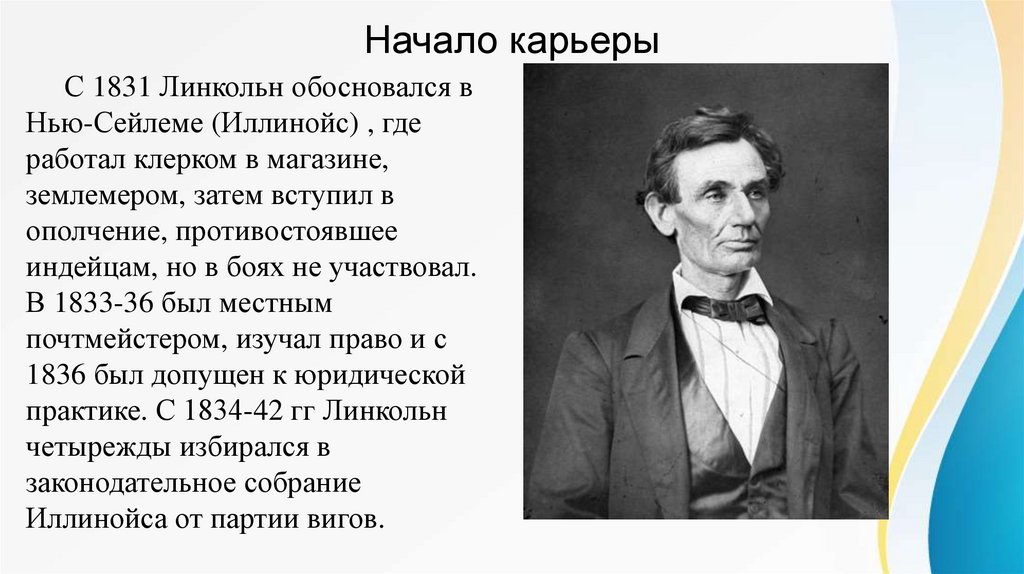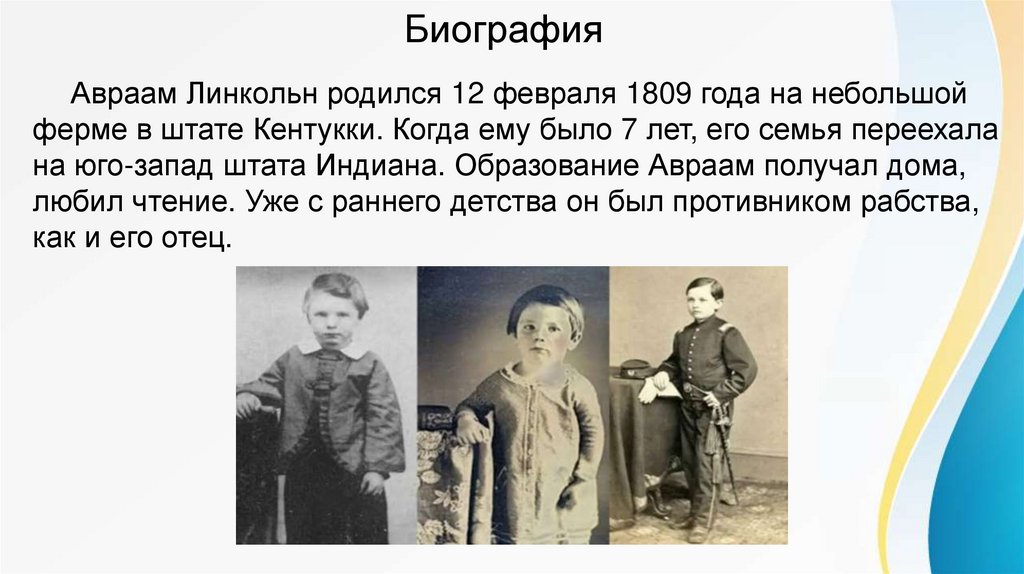 БиографияАвраам Линкольн родился 12 февраля 1809 года на небольшой