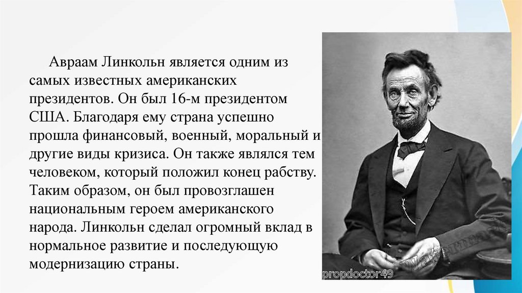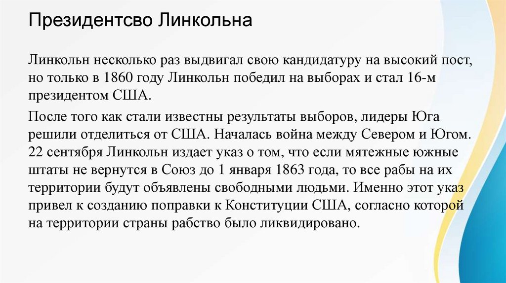 но только в 1860 году Линкольн победил на выборах и стал 16-м