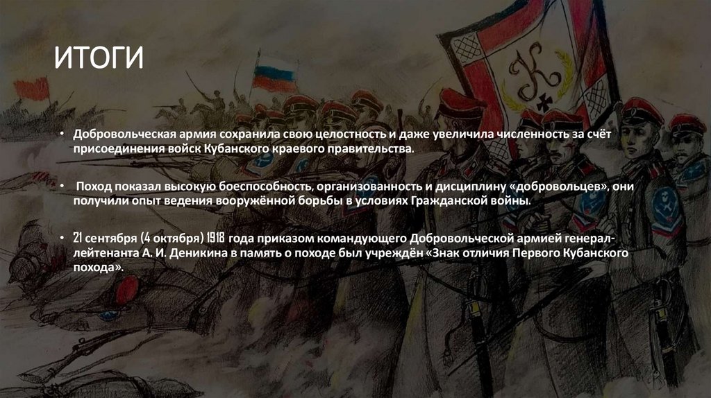 ИТОГИ• Добровольческая армия сохранила свою целостность и даже увеличила численность за счёт