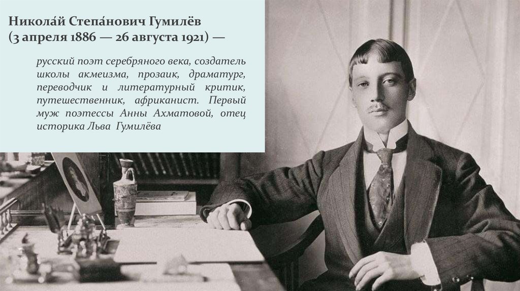 Никола́й Степа́нович Гумилёв(3 апреля 1886 — 26 августа 1921) —