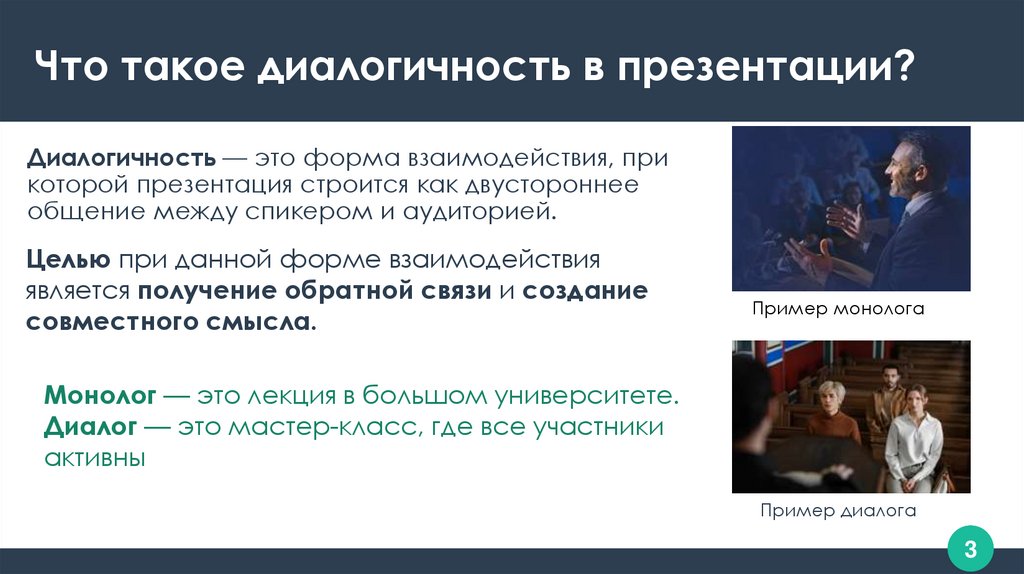 Что такое диалогичность в презентации?Диалогичность — это форма взаимодействия, при