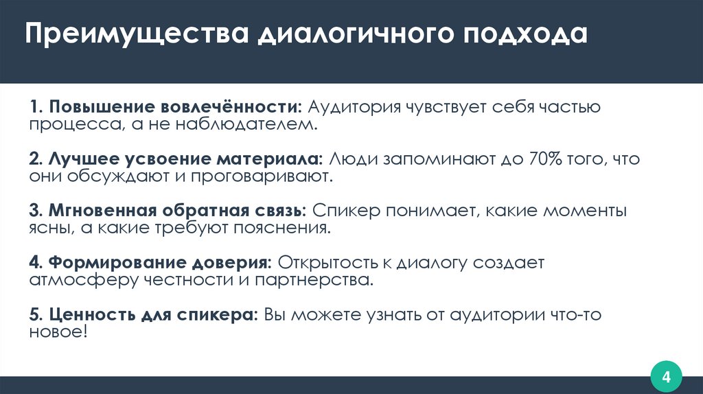 Преимущества диалогичного подхода1. Повышение вовлечённости: Аудитория чувствует себя частью