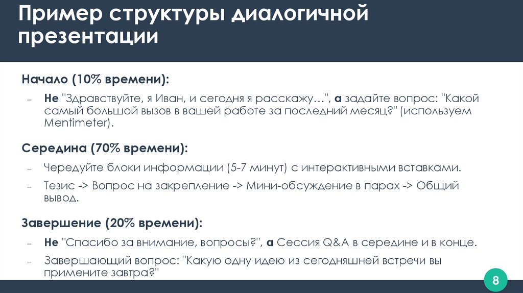 Чередуйте блоки информации (5-7 минут) с интерактивными вставками.