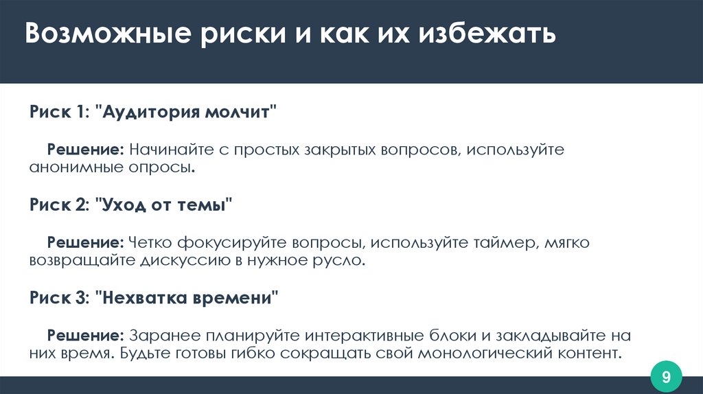 Возможные риски и как их избежатьРиск 1: "Аудитория молчит"