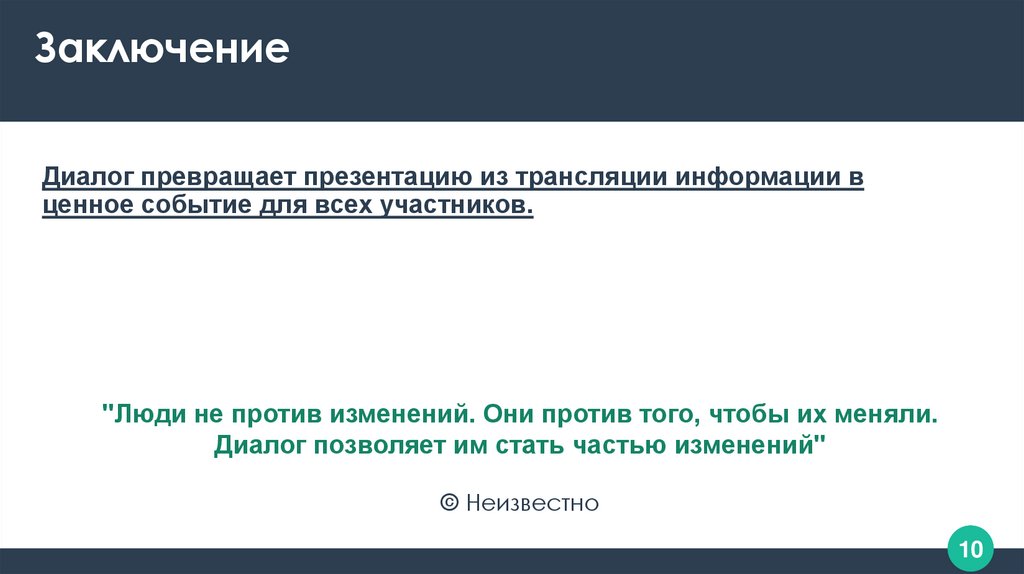 ЗаключениеДиалог превращает презентацию из трансляции информации в