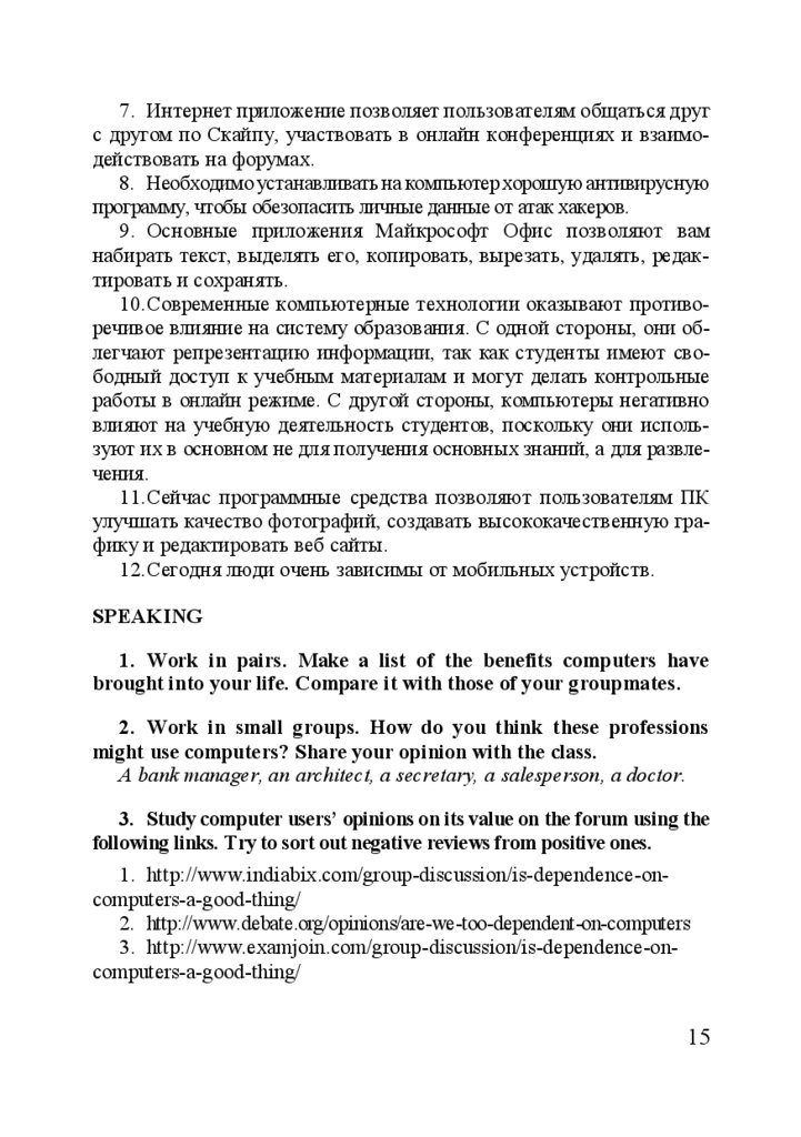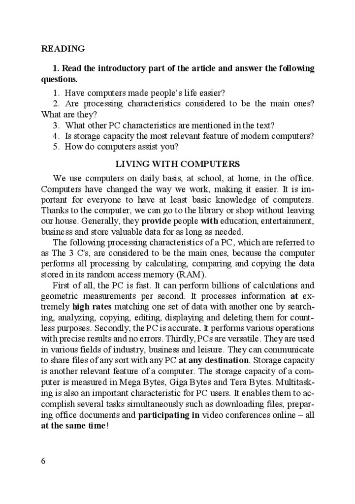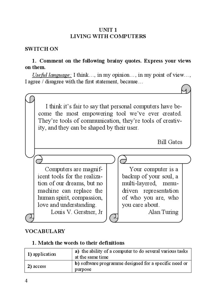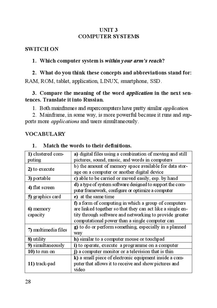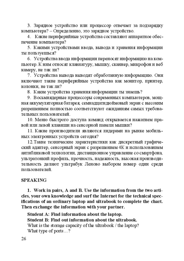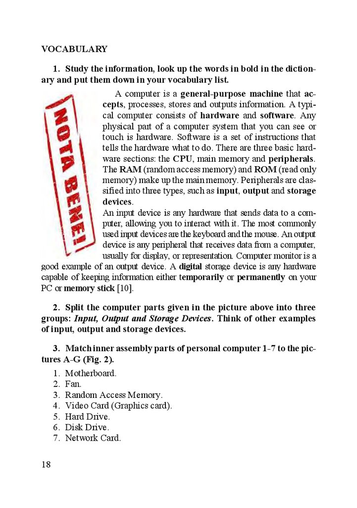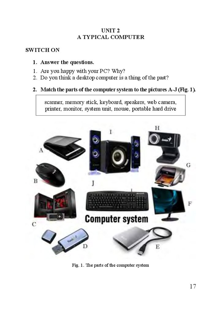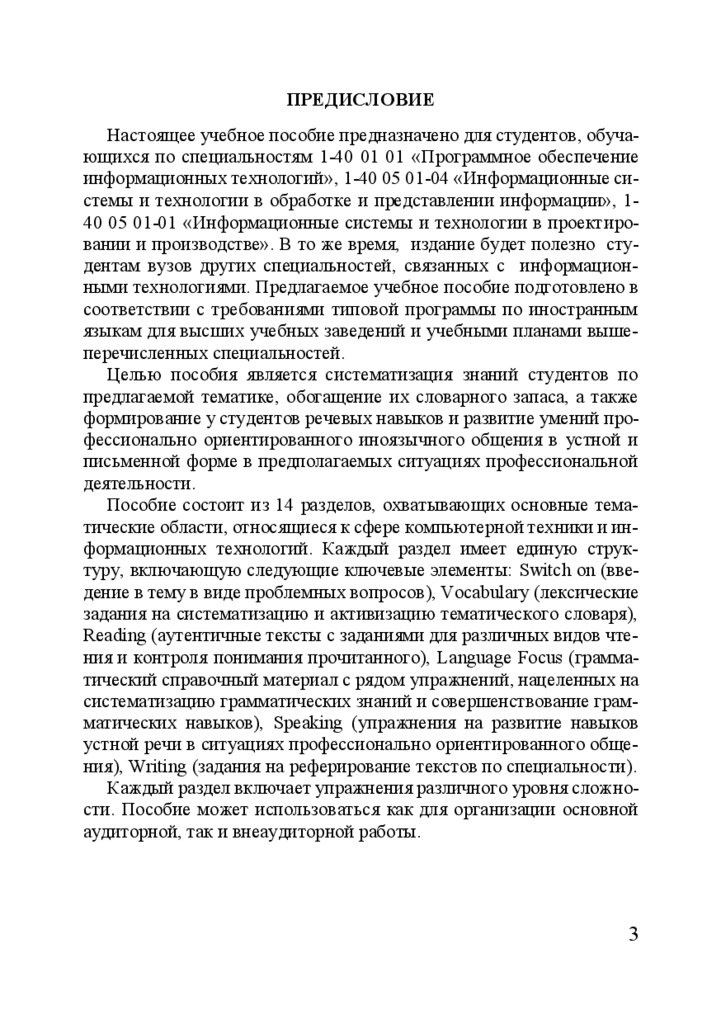 Пособие состоит из 14 разделов, охватывающих основные тематические области, относящиеся к сфере компьютерной техники и информационных технологий. Каждый раздел имеет единую структуру, включающую следующие ключевые элементы: Switch on (введение в тему в виде проблемных вопросов), Vocabulary (лексические