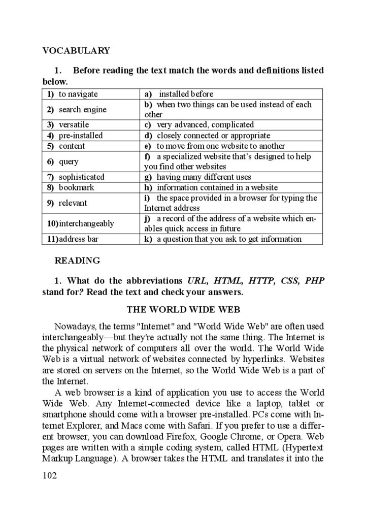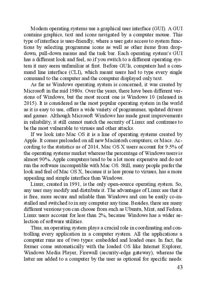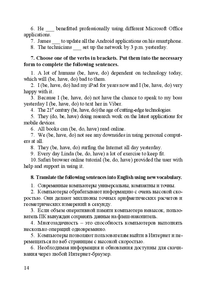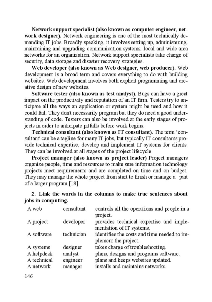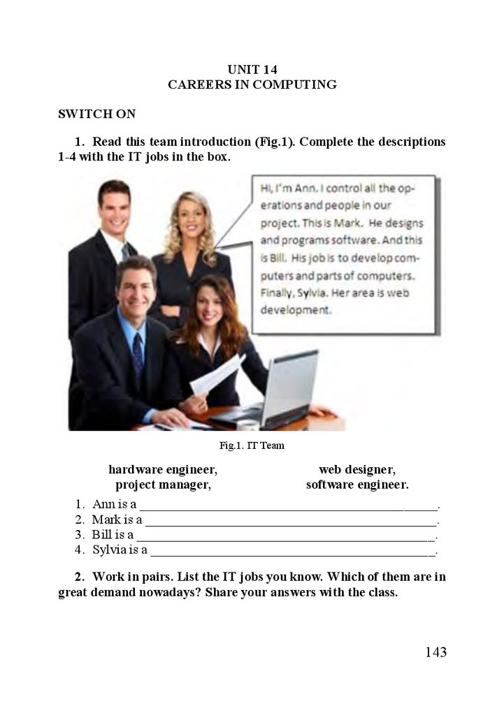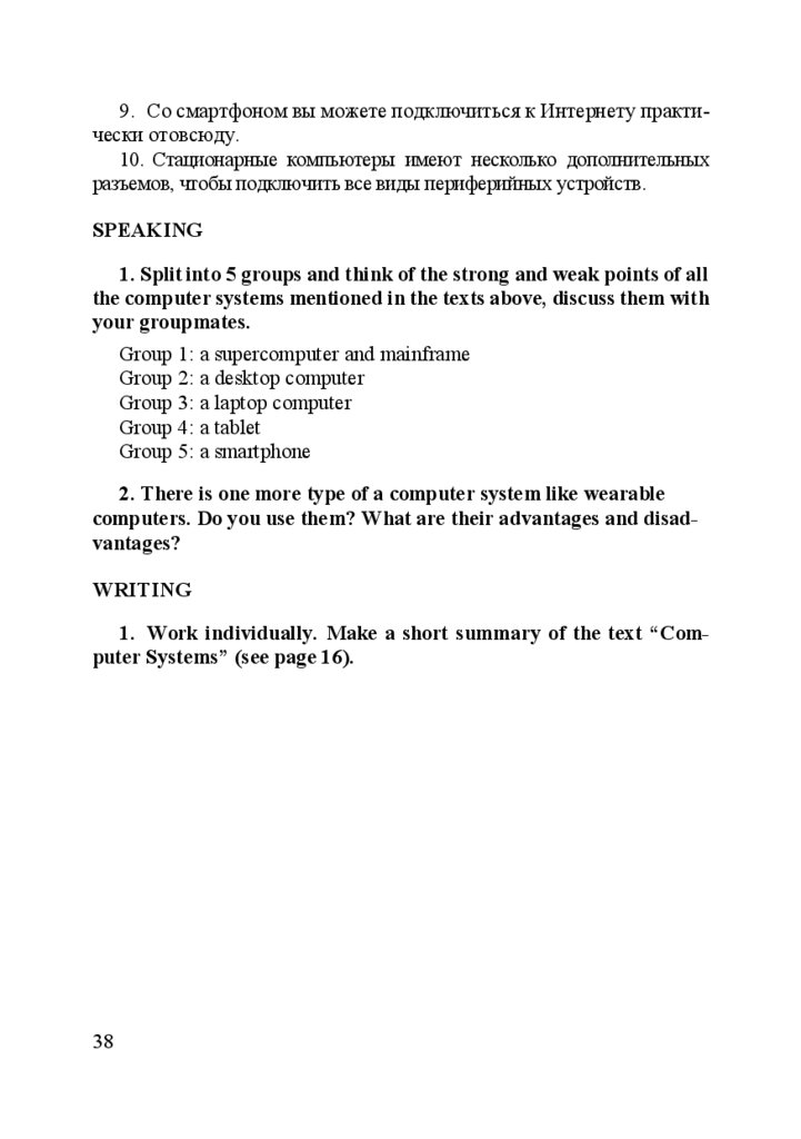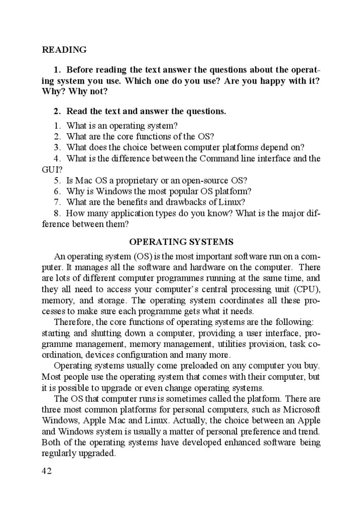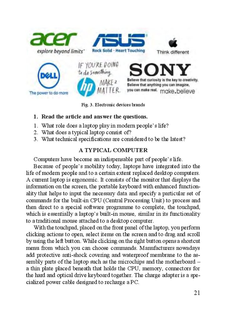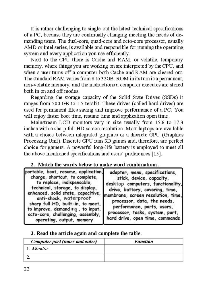 Пособие состоит из 14 разделов, охватывающих основные тематические области, относящиеся к сфере компьютерной техники и информационных технологий. Каждый раздел имеет единую структуру, включающую следующие ключевые элементы: Switch on (введение в тему в виде проблемных вопросов), Vocabulary (лексические