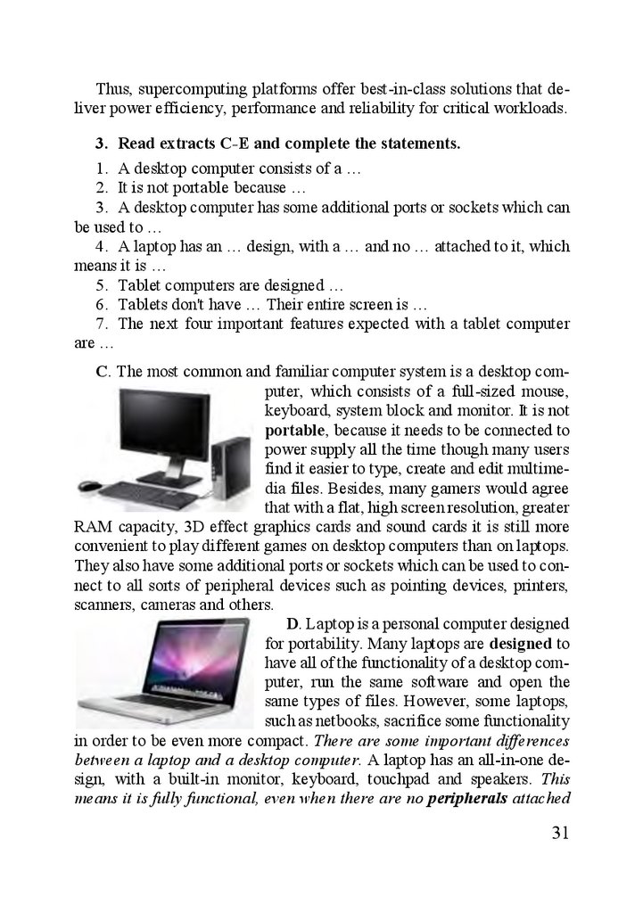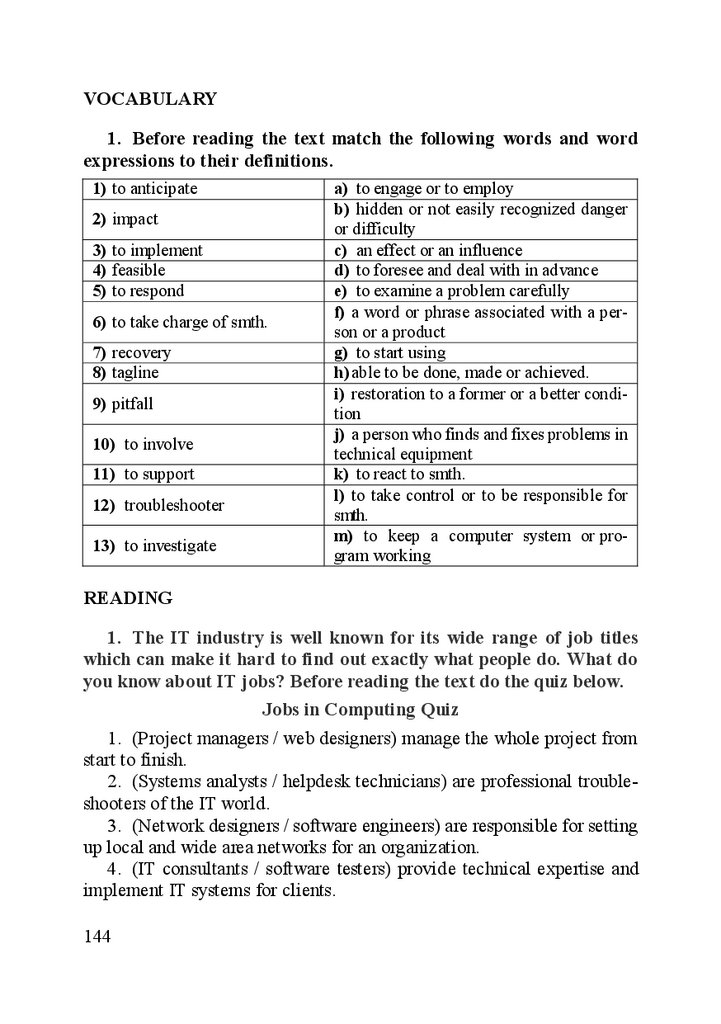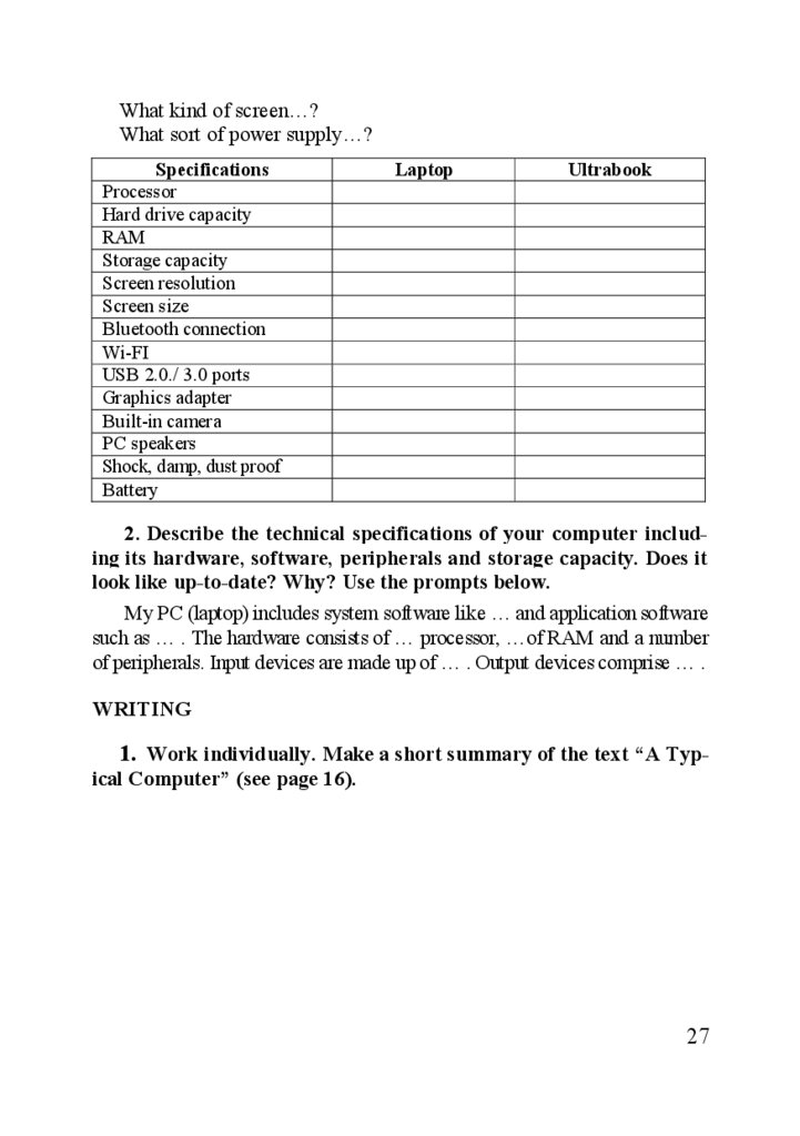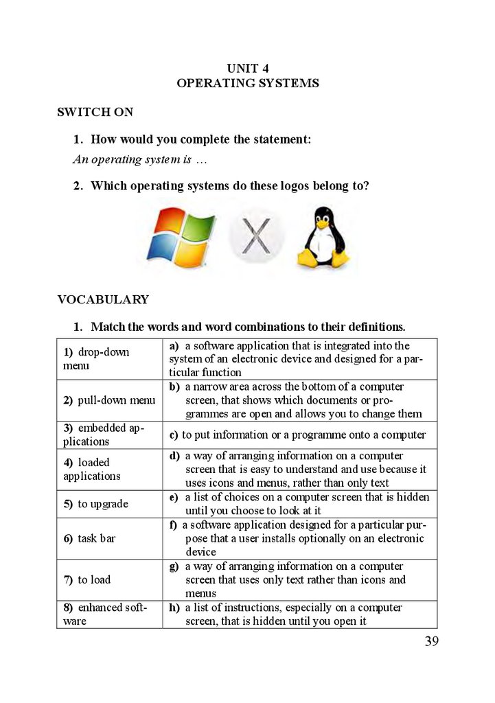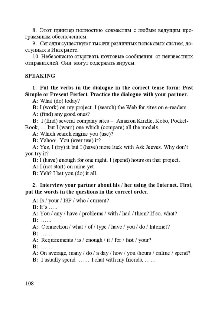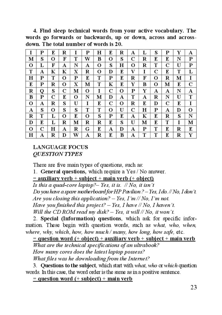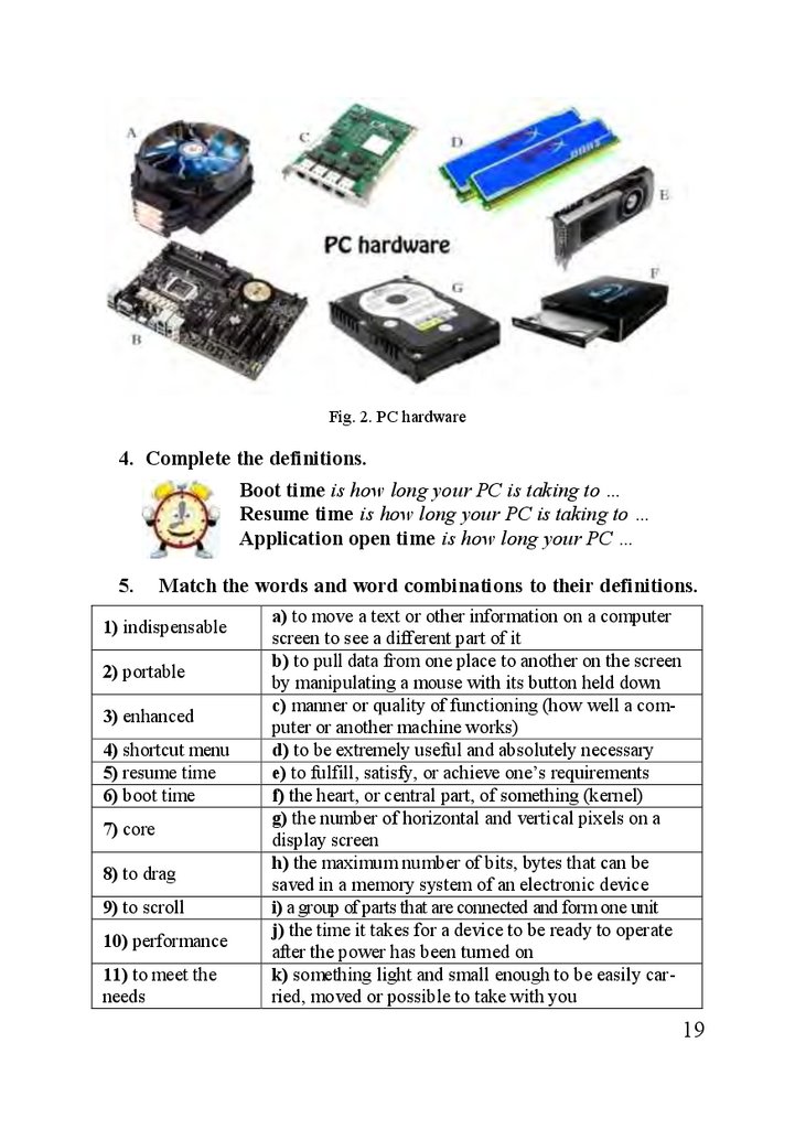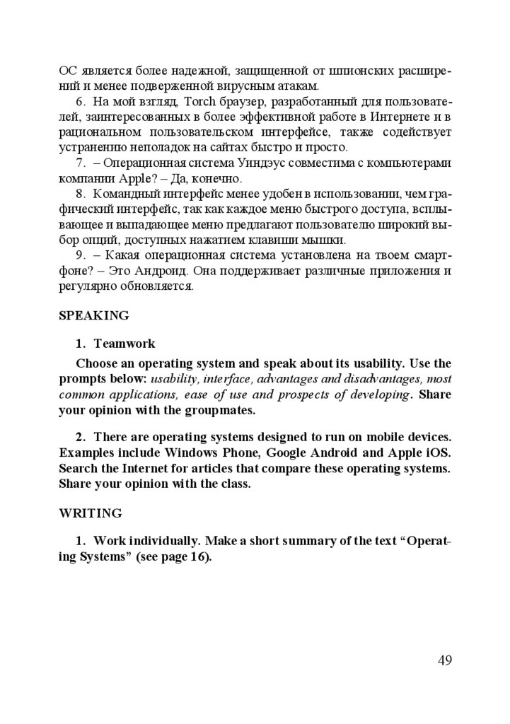 Пособие состоит из 14 разделов, охватывающих основные тематические области, относящиеся к сфере компьютерной техники и информационных технологий. Каждый раздел имеет единую структуру, включающую следующие ключевые элементы: Switch on (введение в тему в виде проблемных вопросов), Vocabulary (лексические