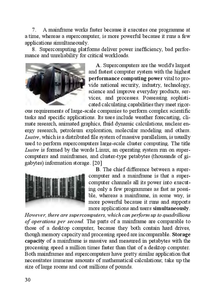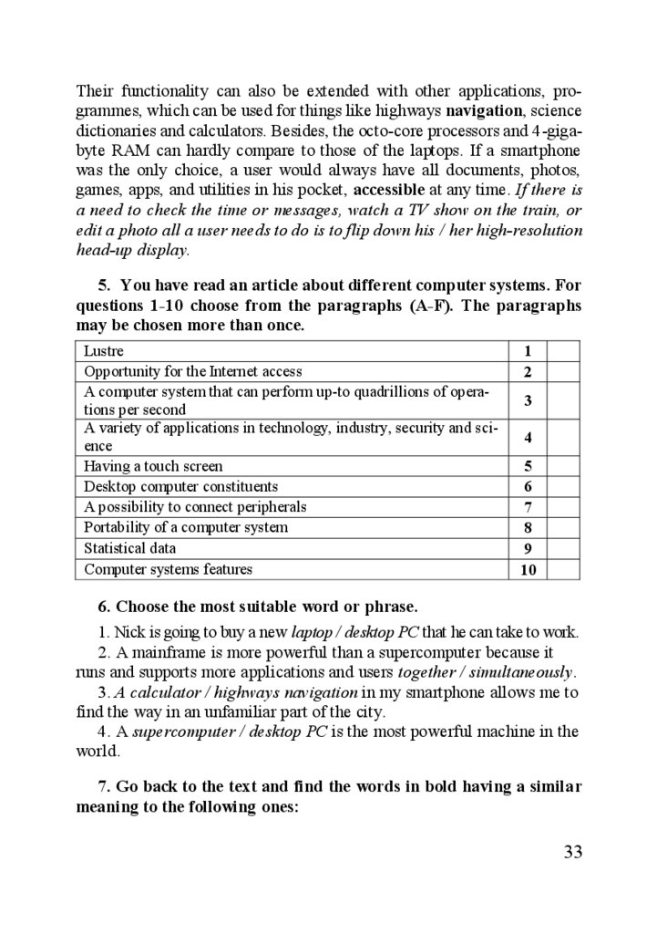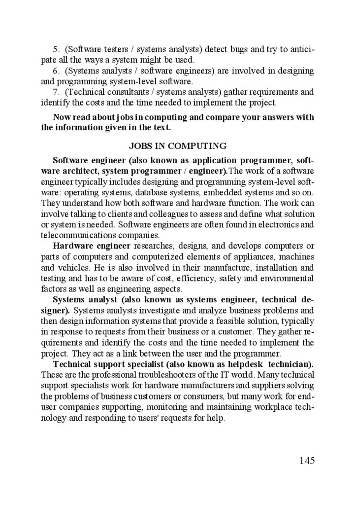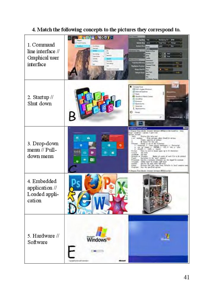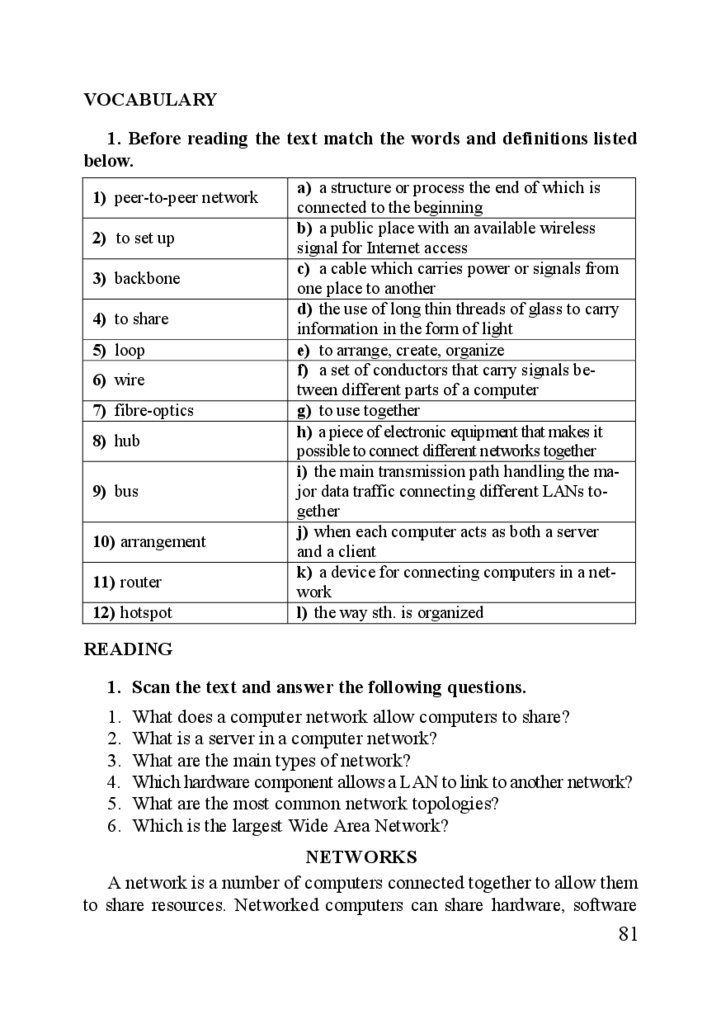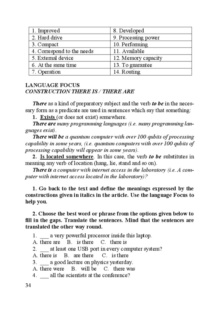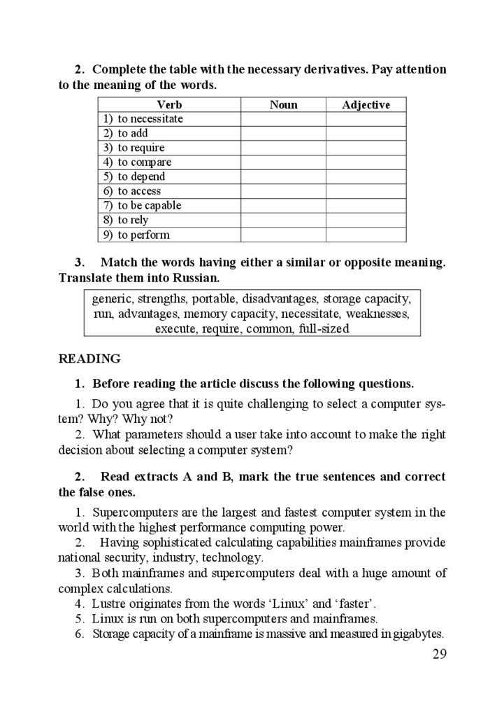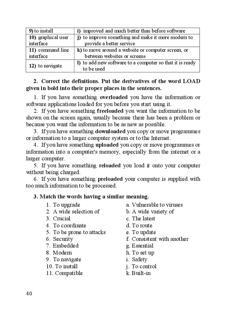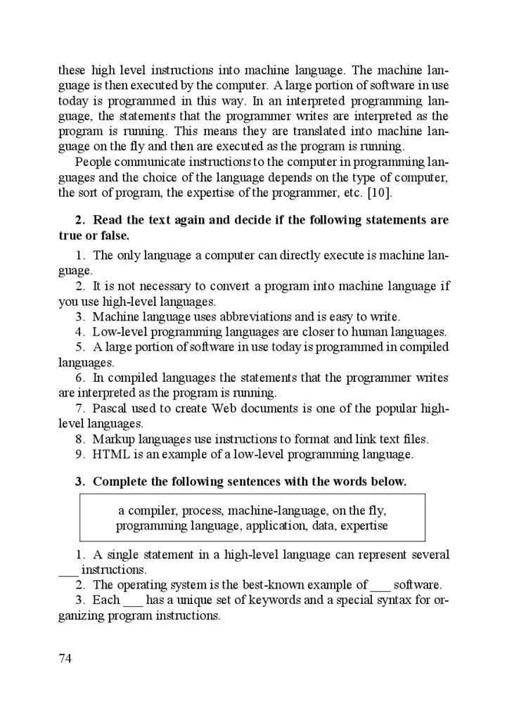 Пособие состоит из 14 разделов, охватывающих основные тематические области, относящиеся к сфере компьютерной техники и информационных технологий. Каждый раздел имеет единую структуру, включающую следующие ключевые элементы: Switch on (введение в тему в виде проблемных вопросов), Vocabulary (лексические
