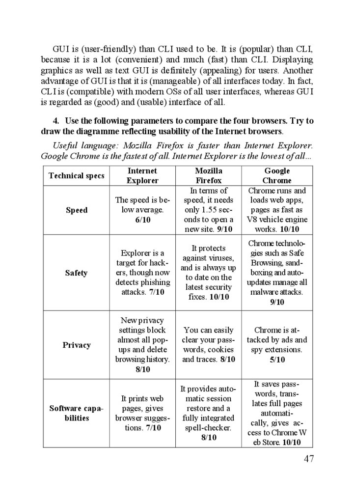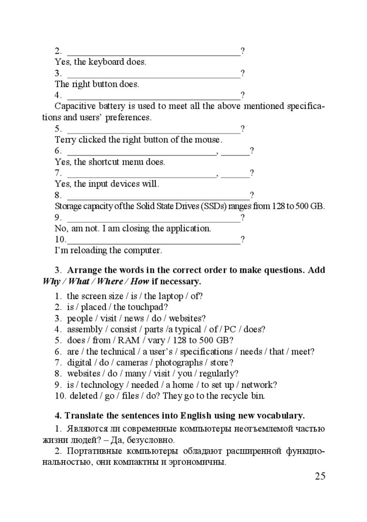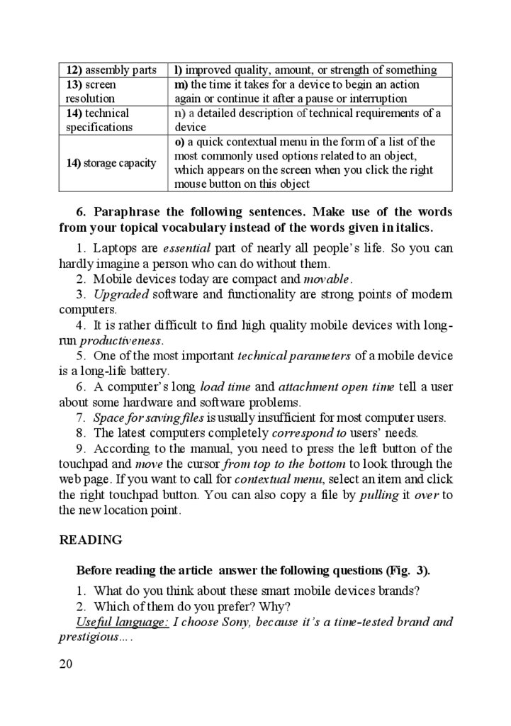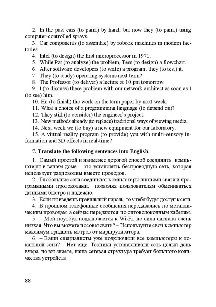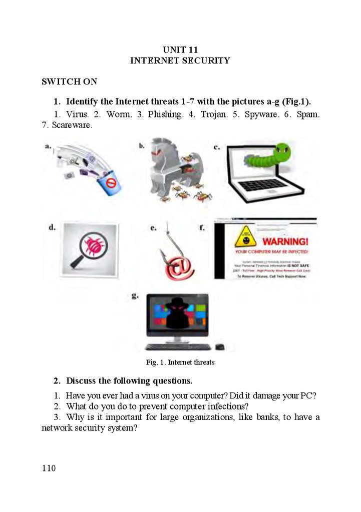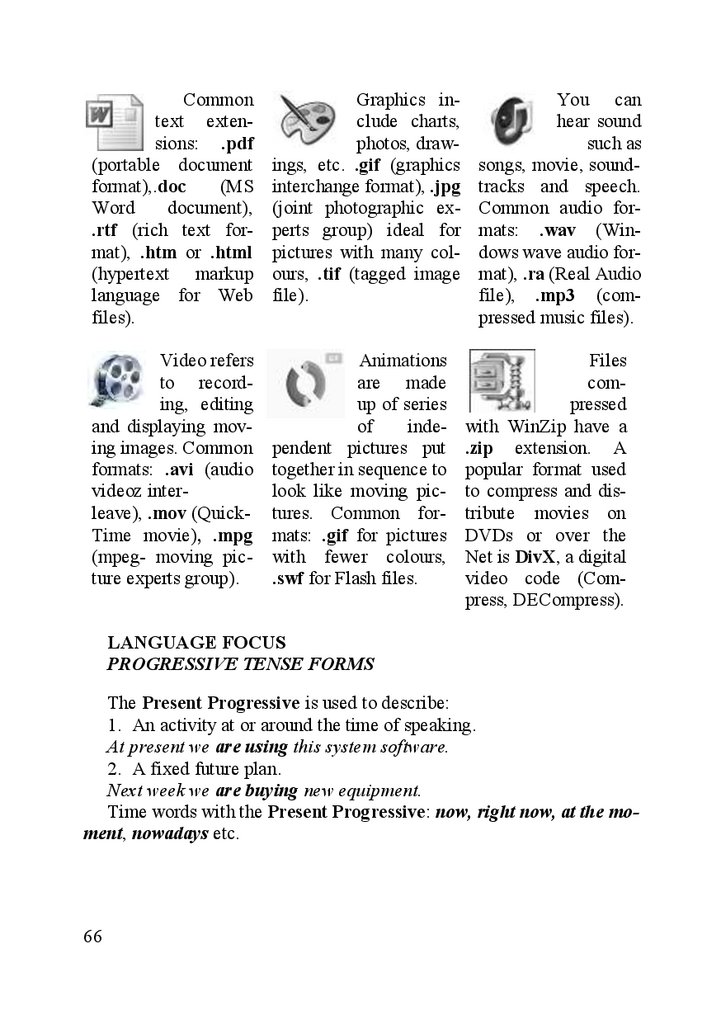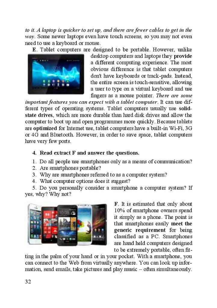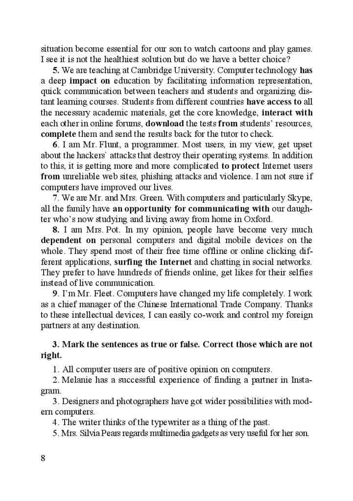 Пособие состоит из 14 разделов, охватывающих основные тематические области, относящиеся к сфере компьютерной техники и информационных технологий. Каждый раздел имеет единую структуру, включающую следующие ключевые элементы: Switch on (введение в тему в виде проблемных вопросов), Vocabulary (лексические