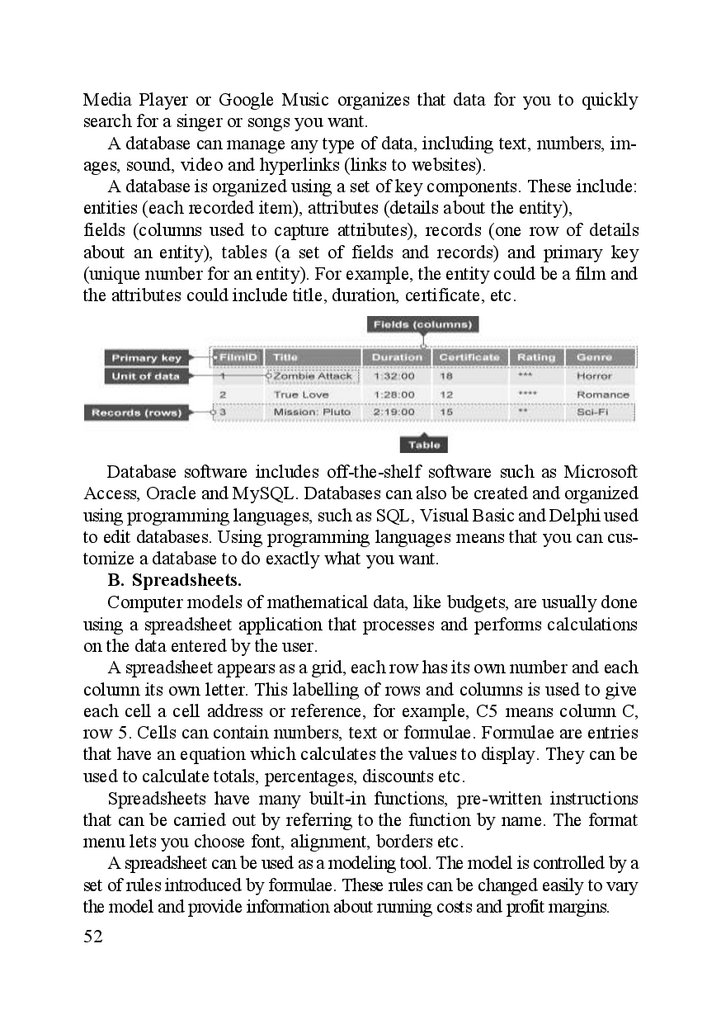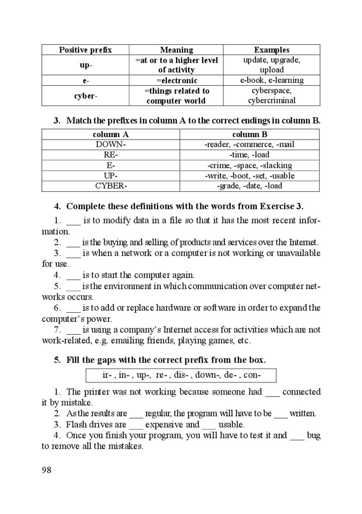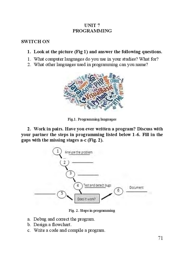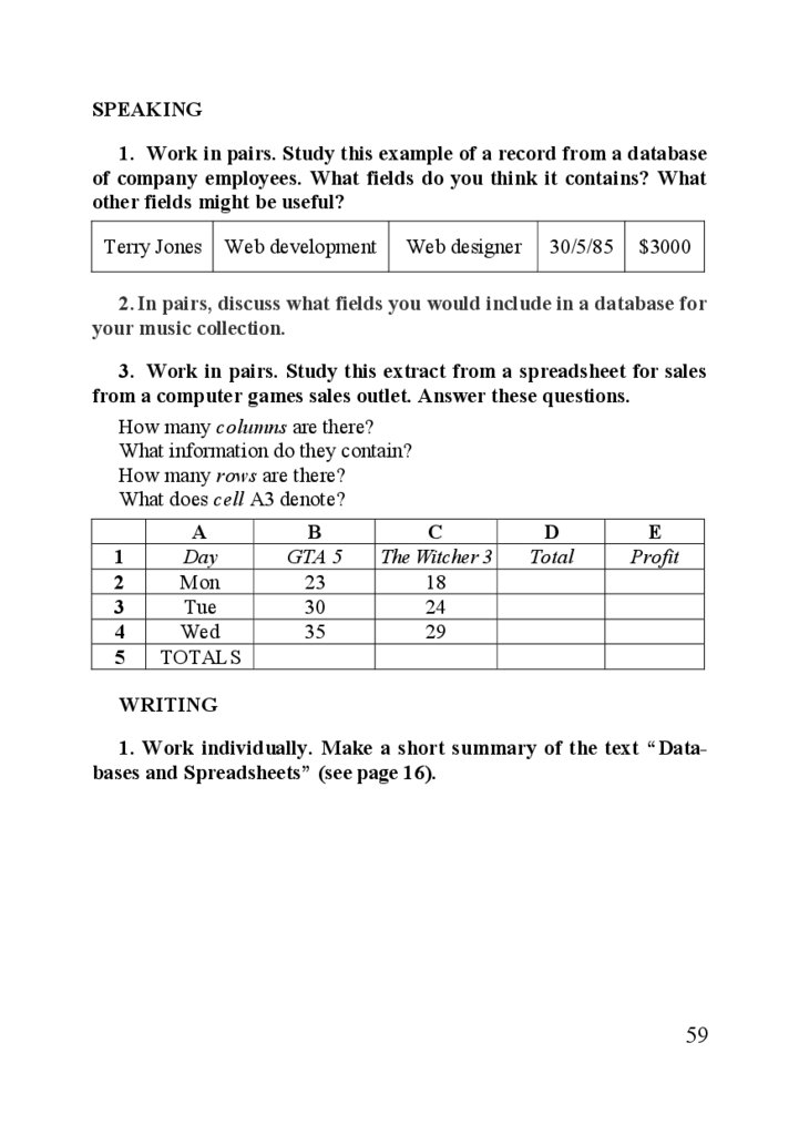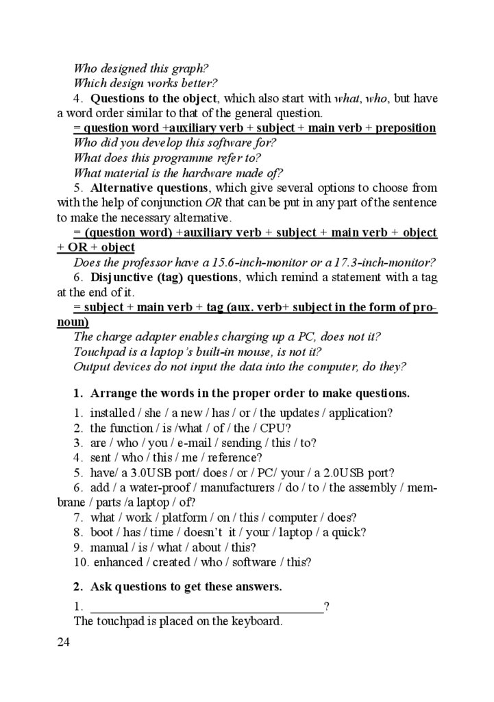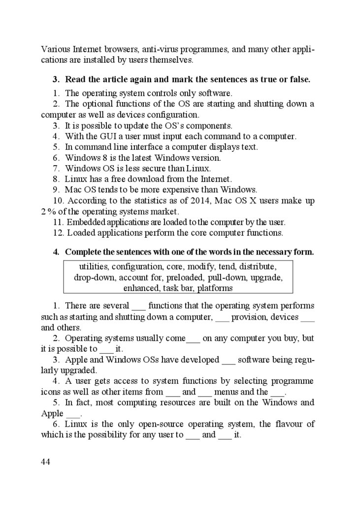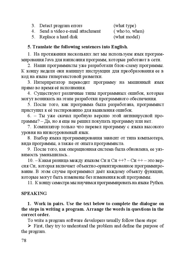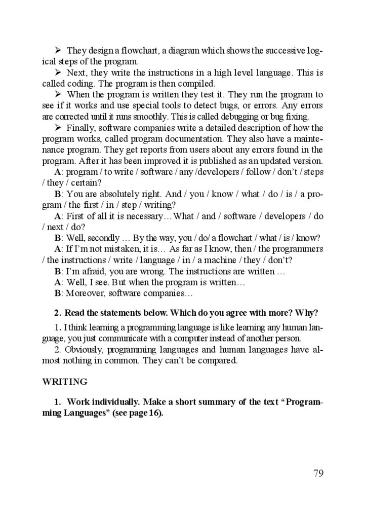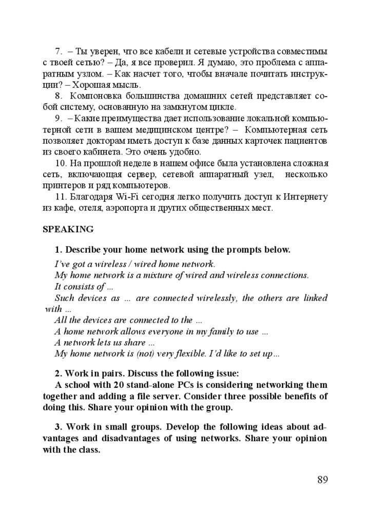 Пособие состоит из 14 разделов, охватывающих основные тематические области, относящиеся к сфере компьютерной техники и информационных технологий. Каждый раздел имеет единую структуру, включающую следующие ключевые элементы: Switch on (введение в тему в виде проблемных вопросов), Vocabulary (лексические