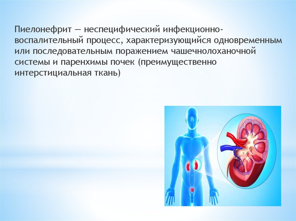 Пиелонефрит — неспецифический инфекционновоспалительный процесс, характеризующийся одновременнымили последовательным поражением чашечнолоханочной