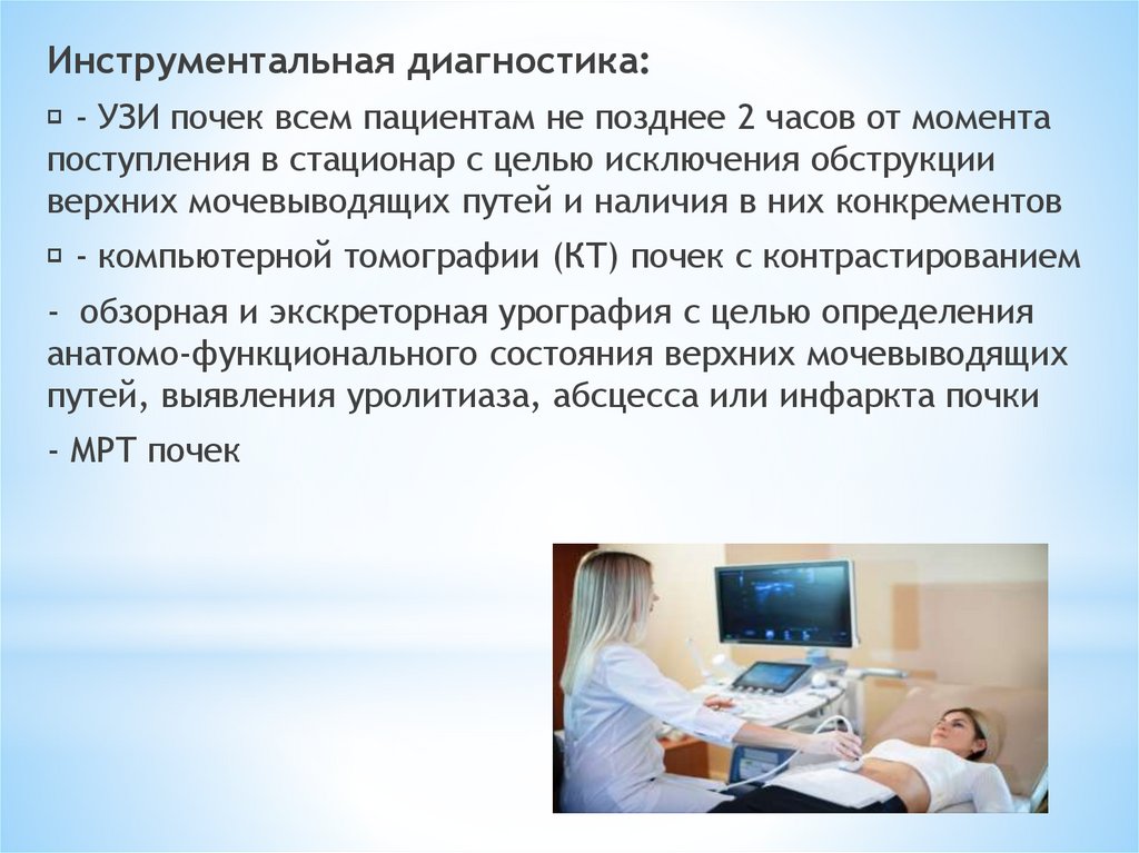 Инструментальная диагностика:- УЗИ почек всем пациентам не позднее 2 часов от момента