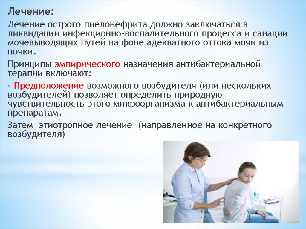 Лечение:Лечение острого пиелонефрита должно заключаться в