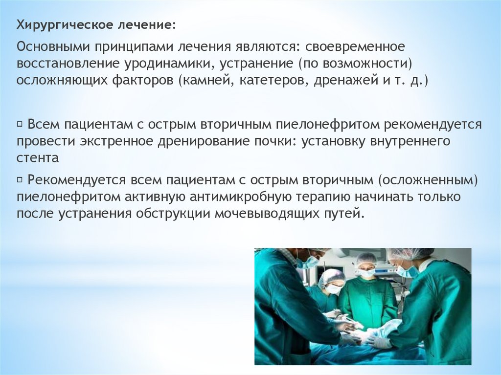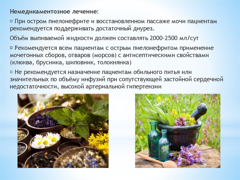 Немедикаментозное лечение:При остром пиелонефрите и восстановленном пассаже мочи пациентам