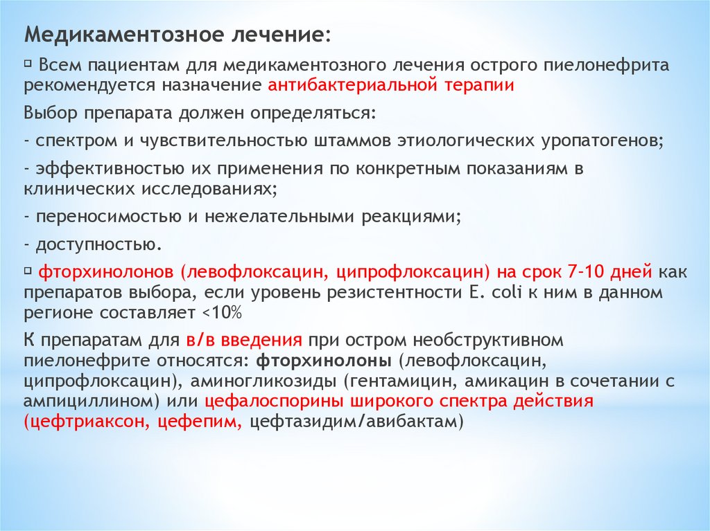 Медикаментозное лечение:Всем пациентам для медикаментозного лечения острого пиелонефрита