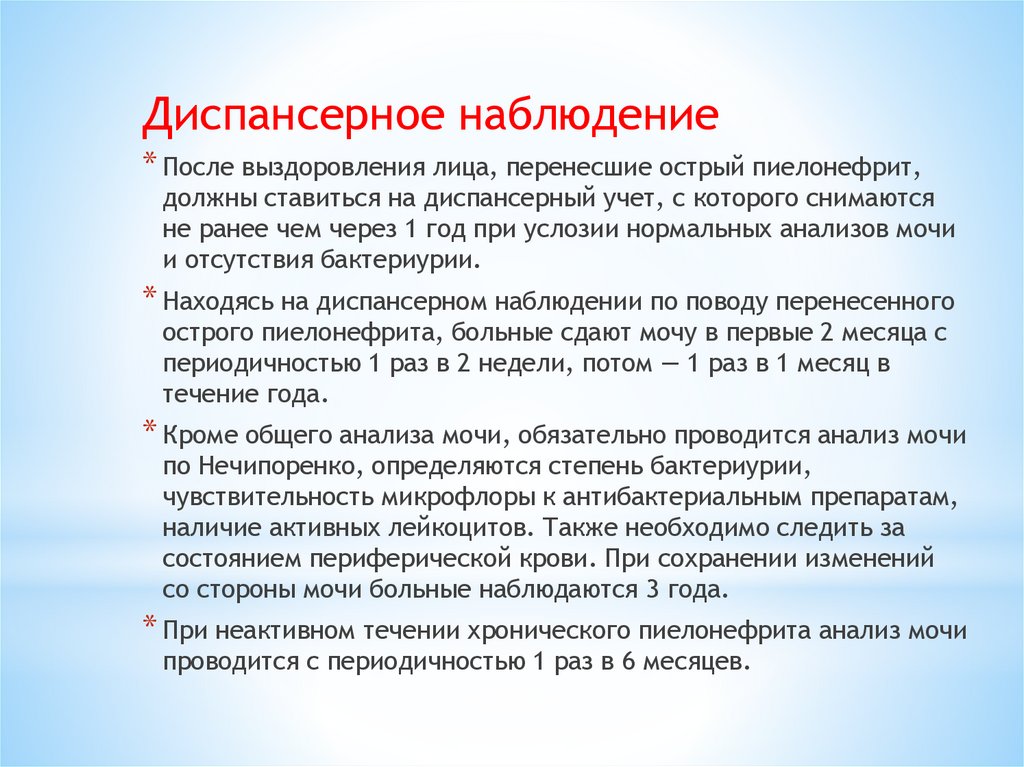 Диспансерное наблюдение* После выздоровления лица, перенесшие острый пиелонефрит,