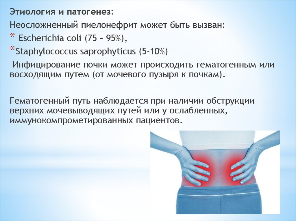 Этиология и патогенез:Неосложненный пиелонефрит может быть вызван: