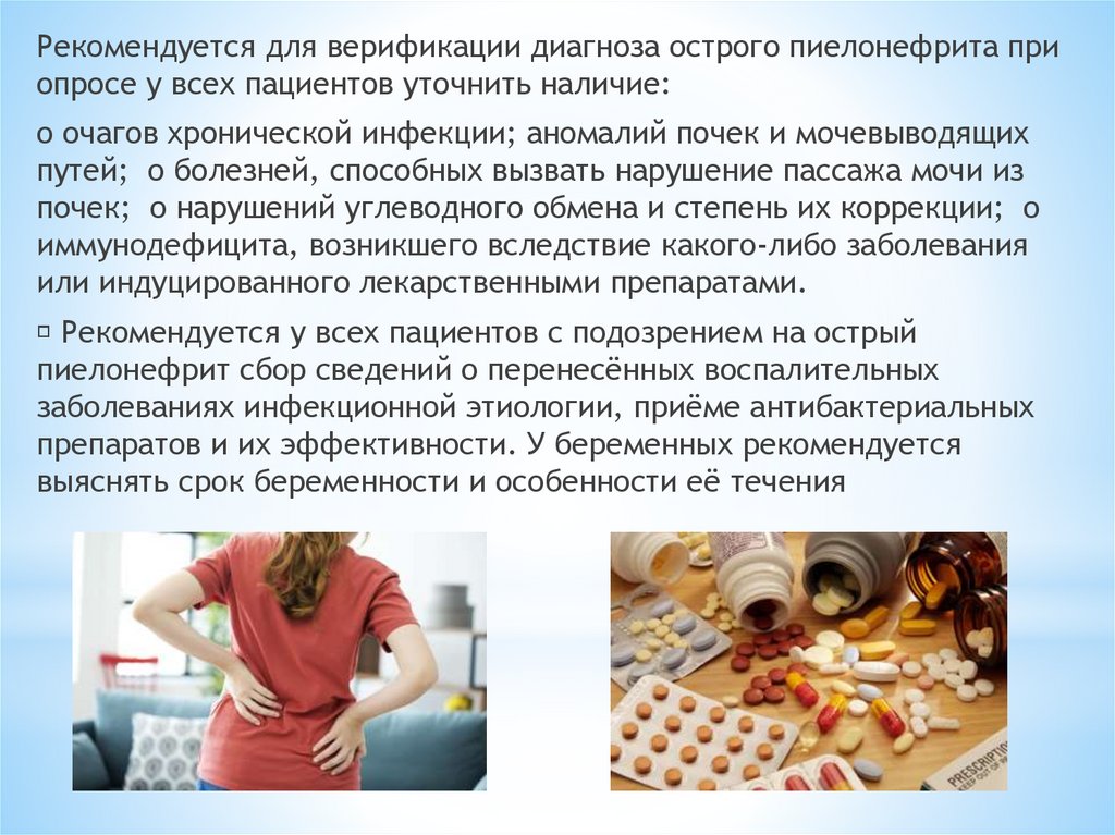 Рекомендуется для верификации диагноза острого пиелонефрита приопросе у всех пациентов уточнить наличие: