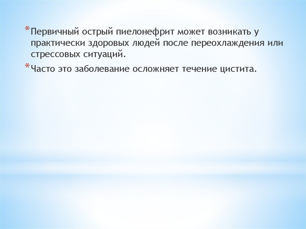 * Первичный острый пиелонефрит может возникать упрактически здоровых людей после переохлаждения или
