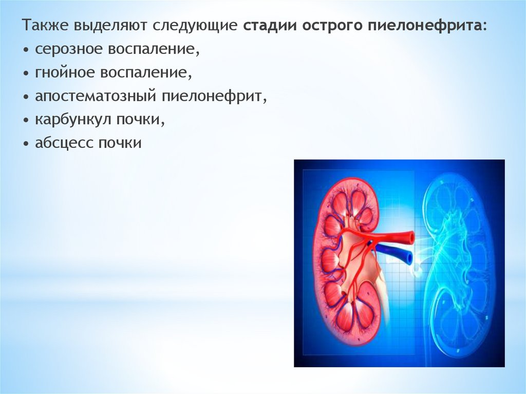 Также выделяют следующие стадии острого пиелонефрита:• серозное воспаление,