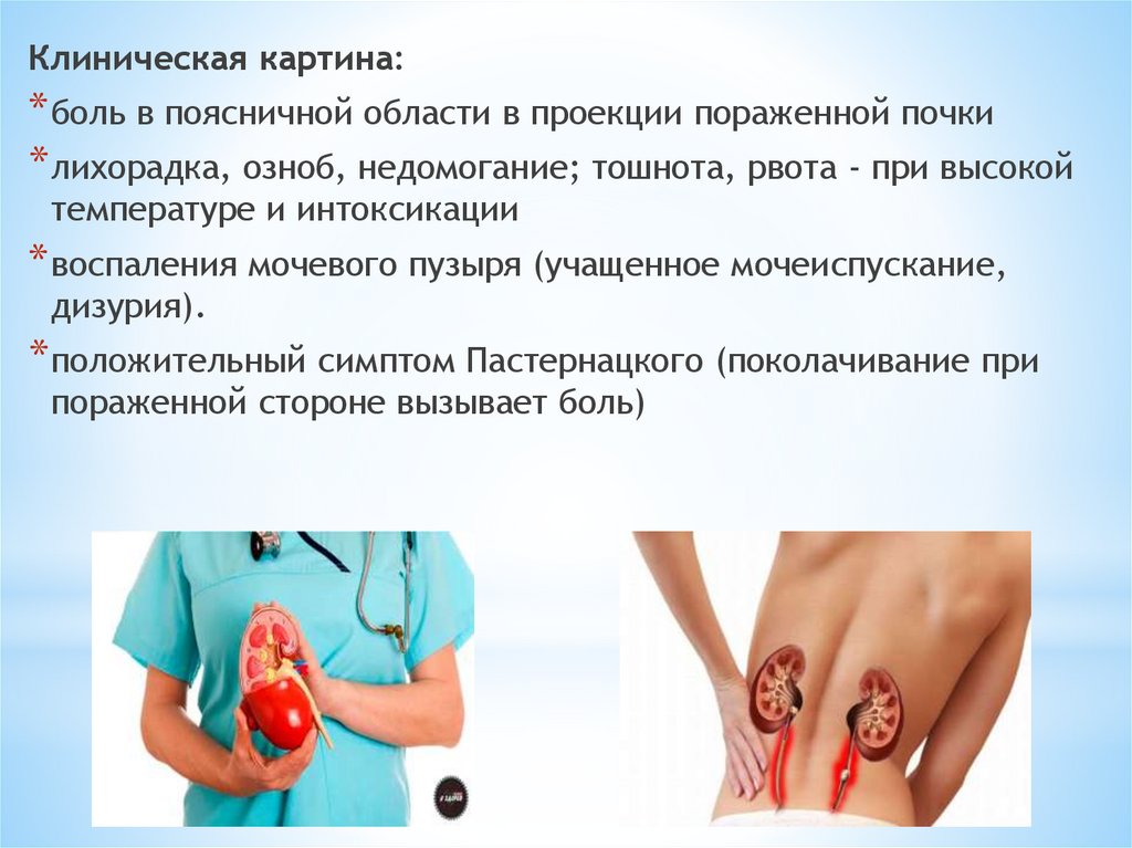 Клиническая картина:* боль в поясничной области в проекции пораженной почки